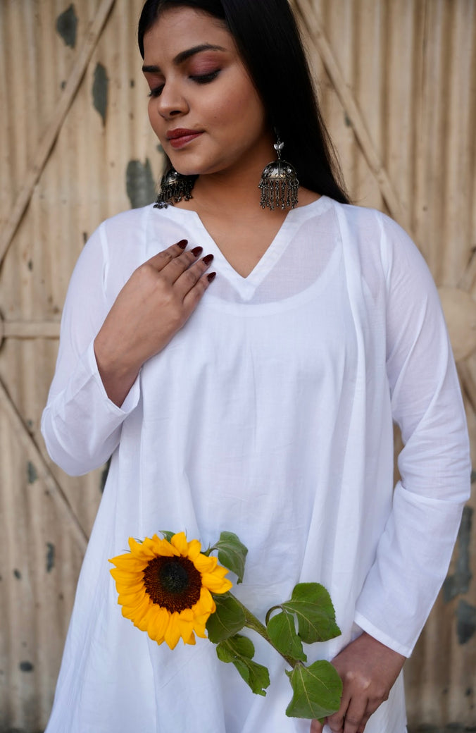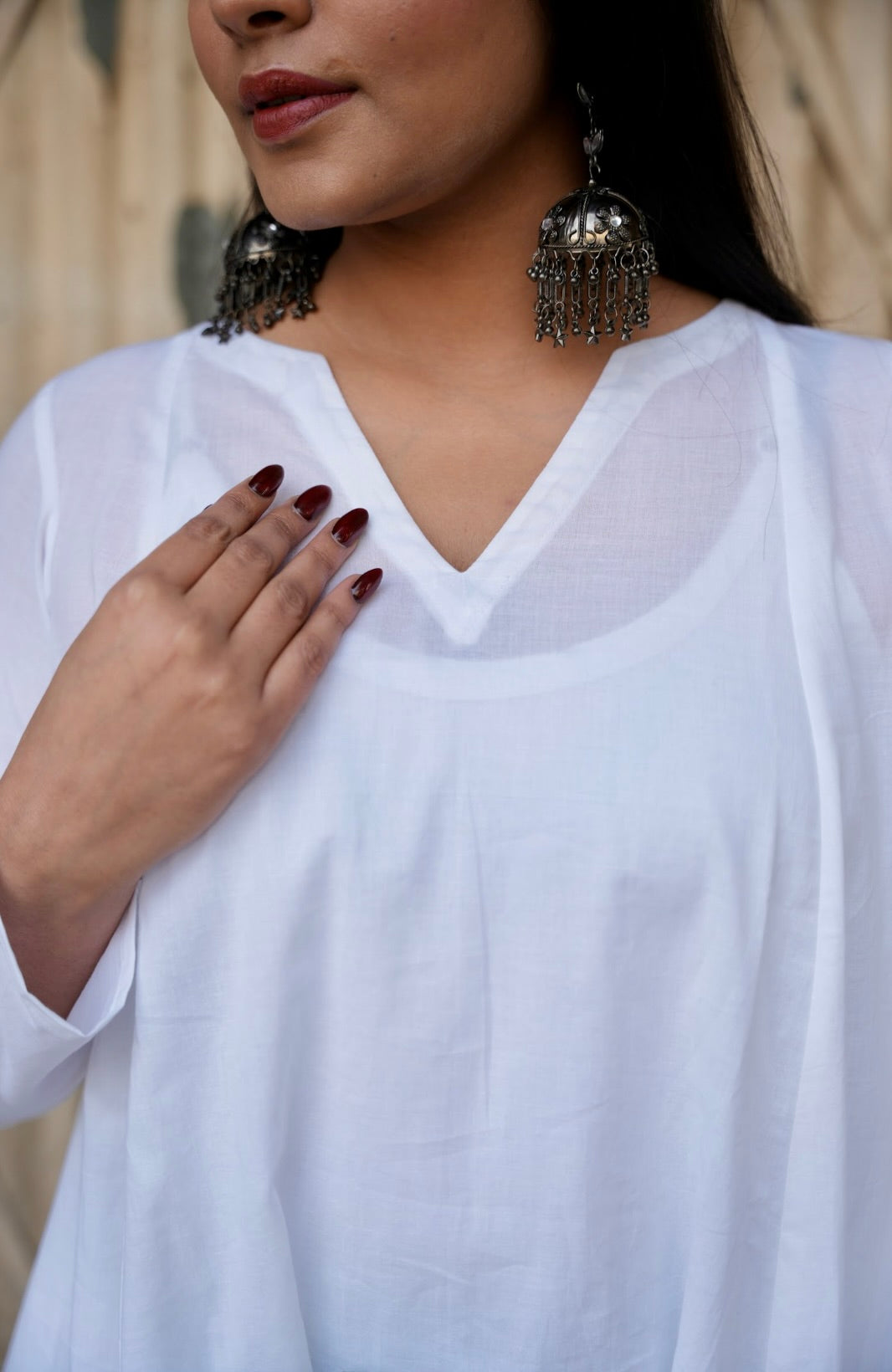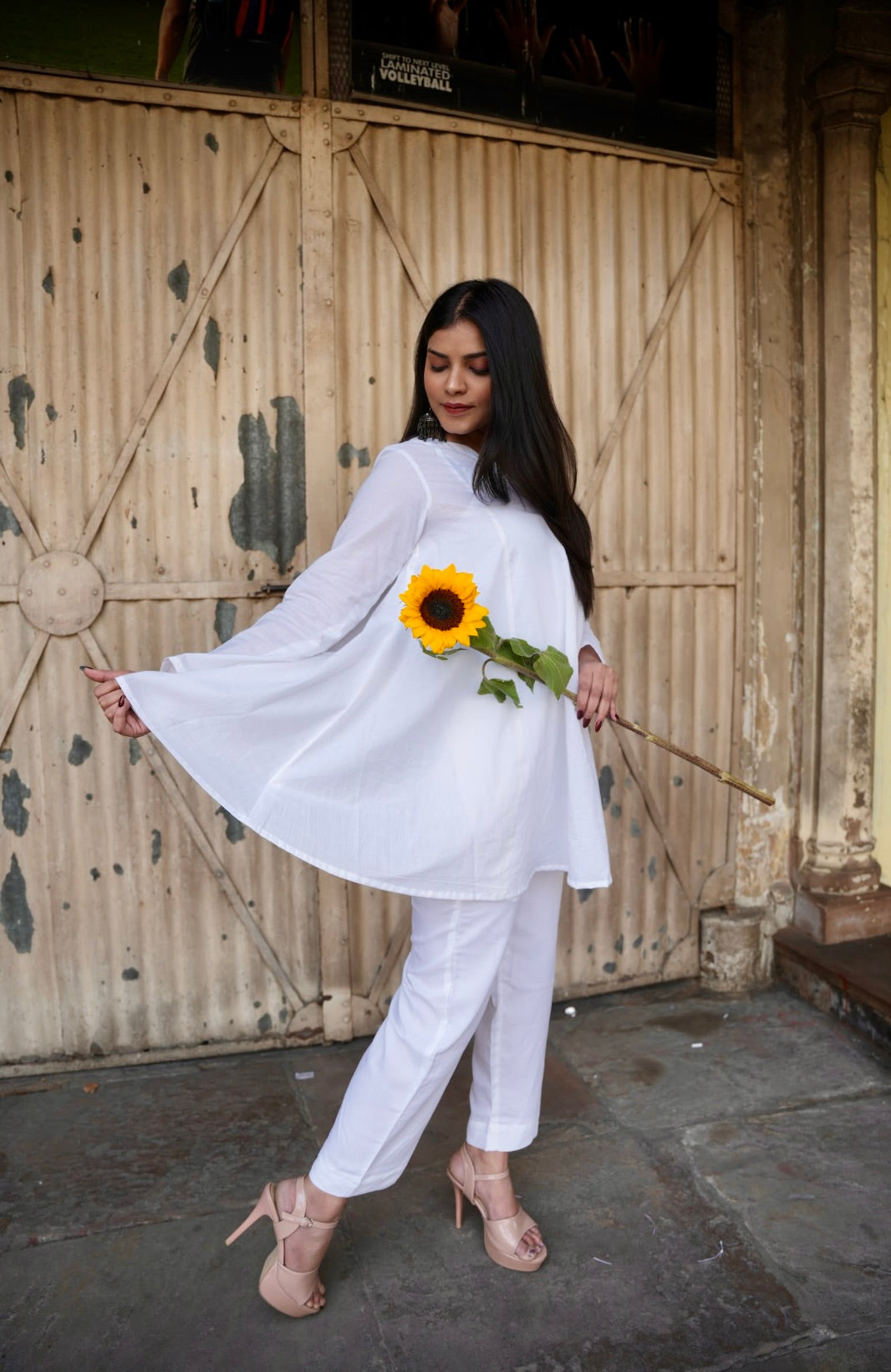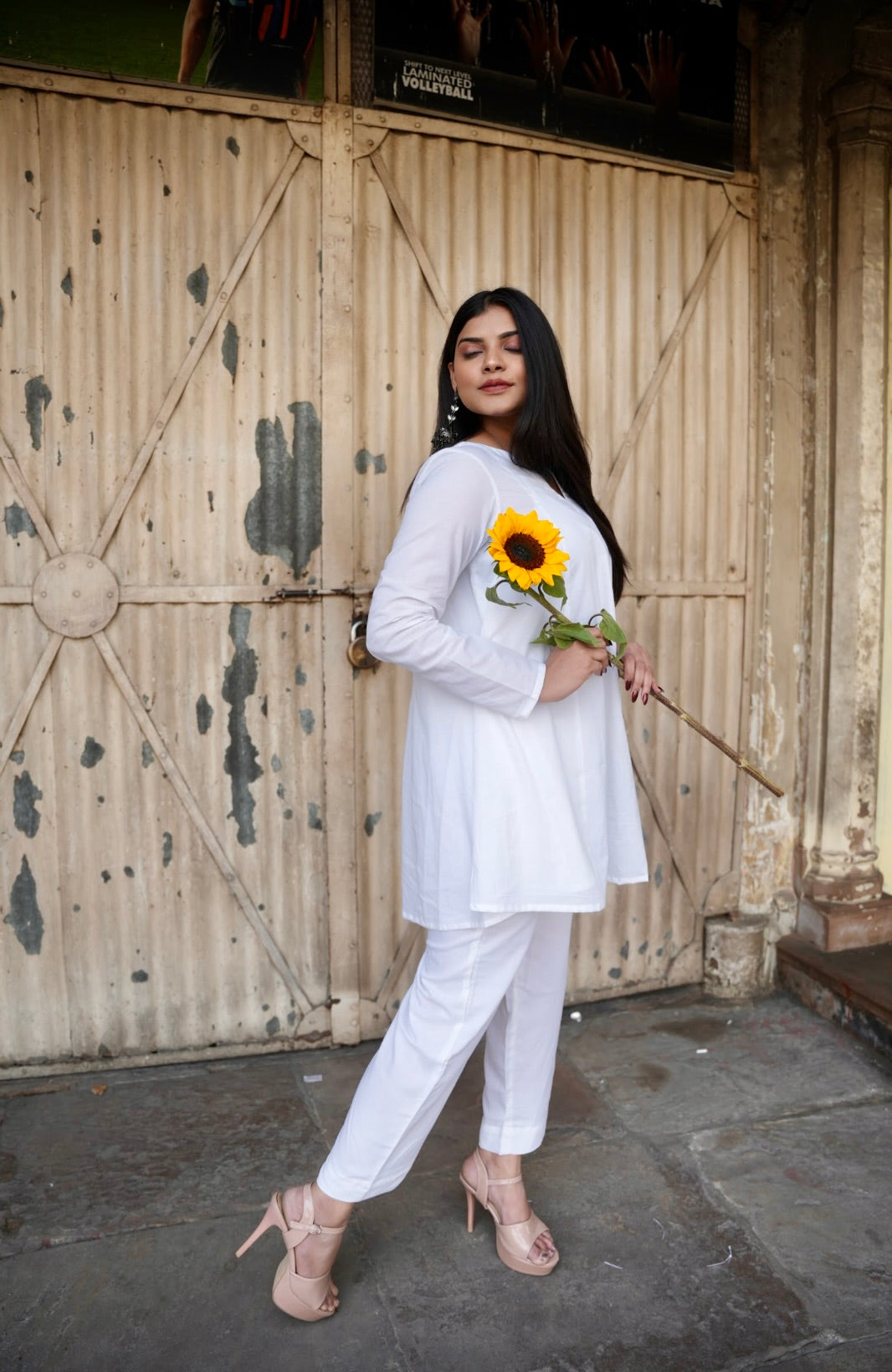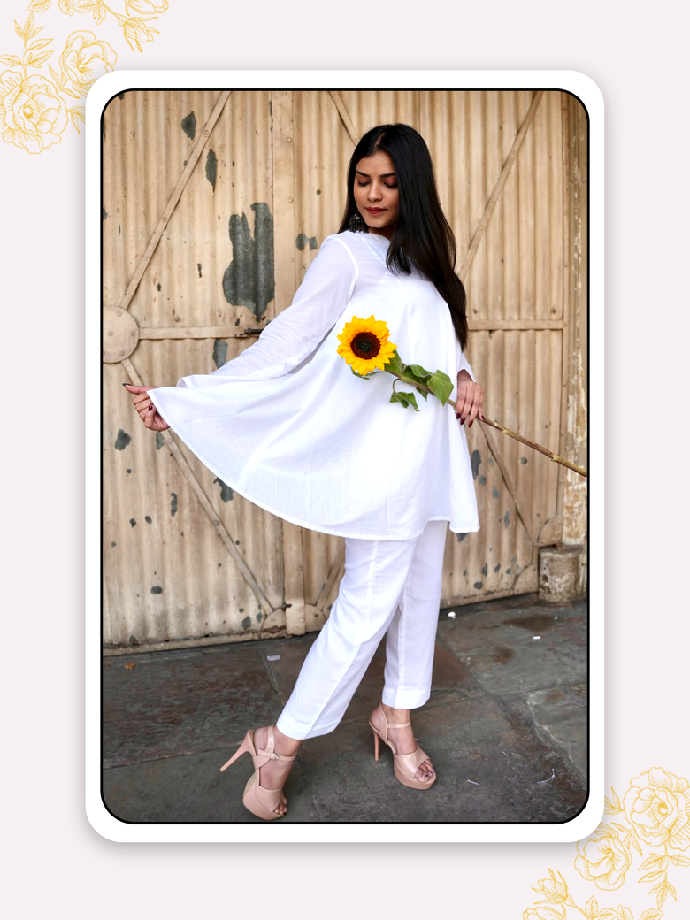 – White stylish corset paired with a short frock and pants, fresh and elegant, made for soft festive mornings.