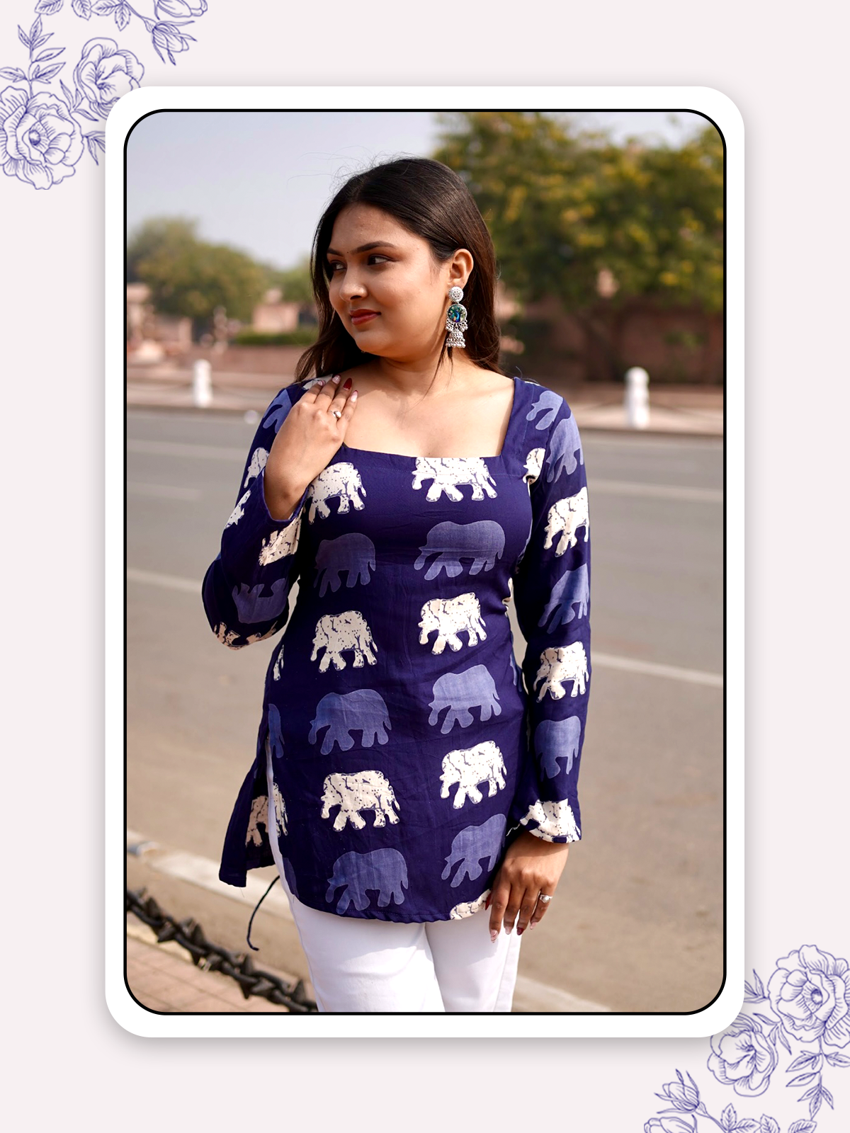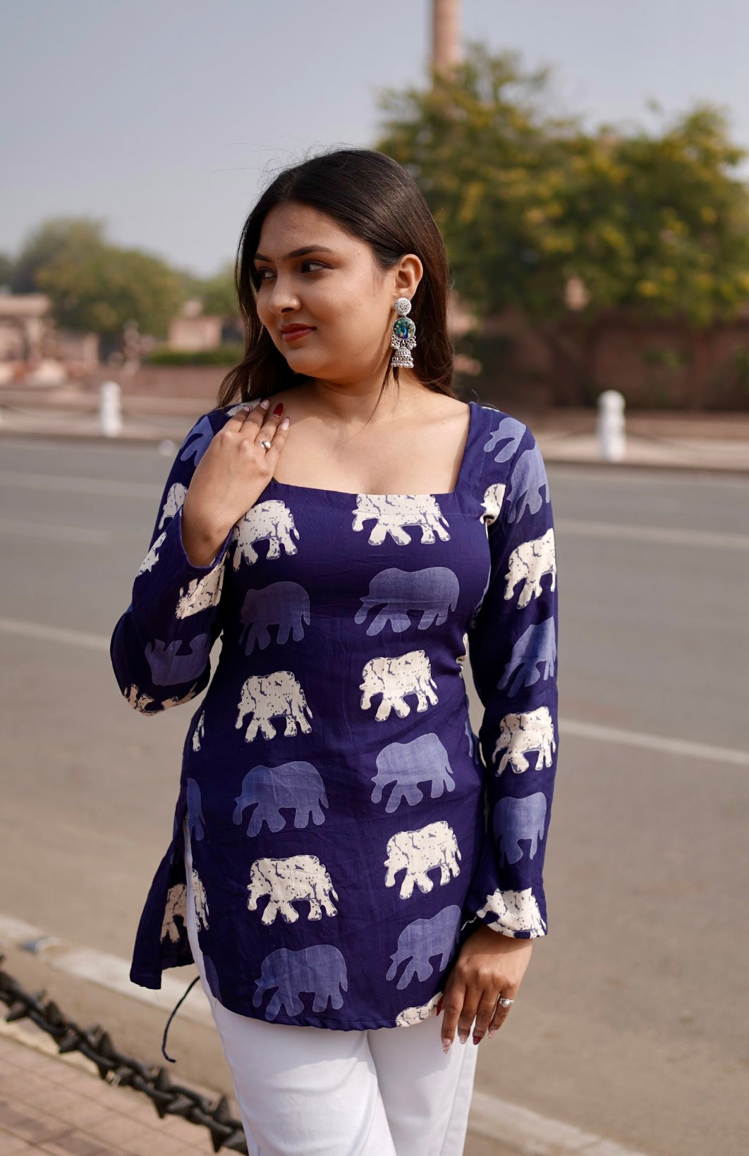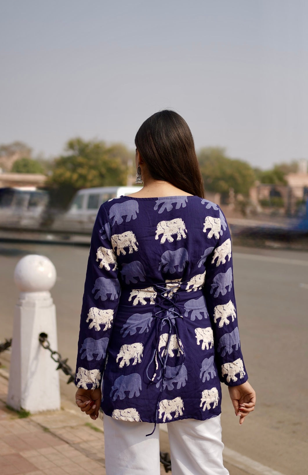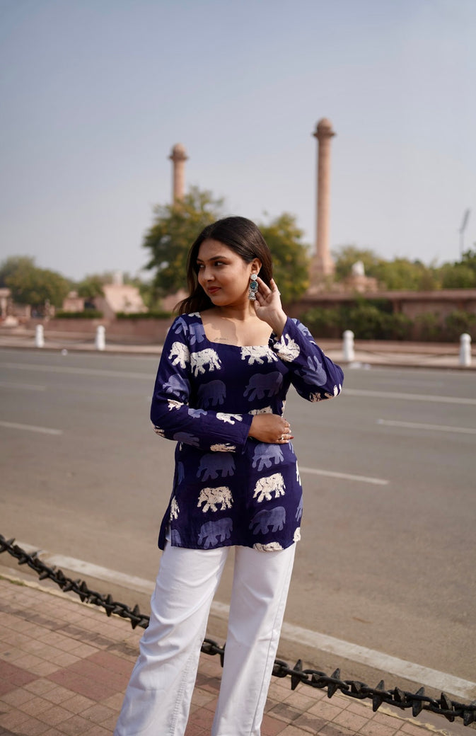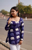 Blue short kurti with light blue and white hathi prints and a corset back, quirky yet stylish with a hint of tradition