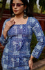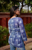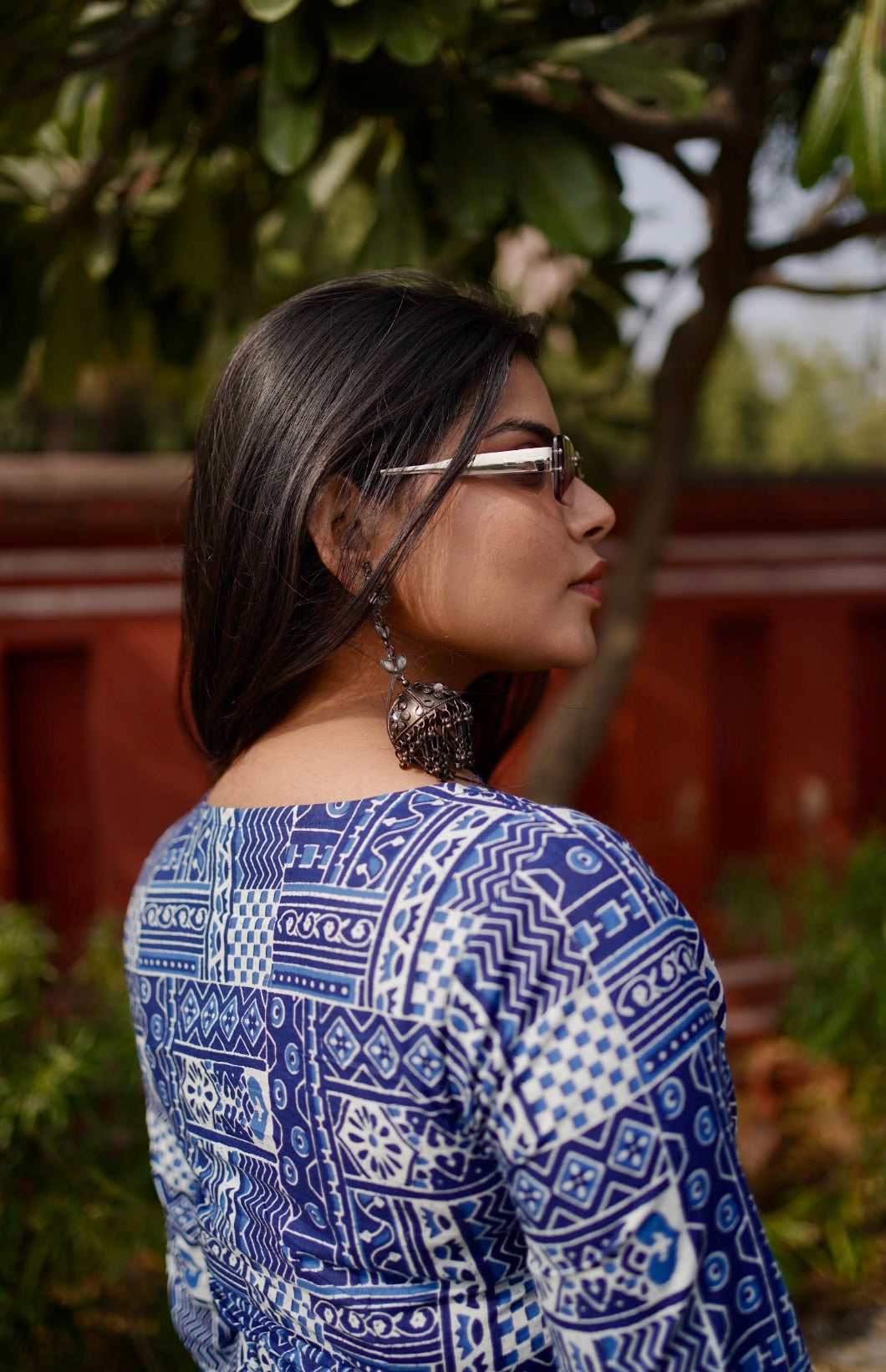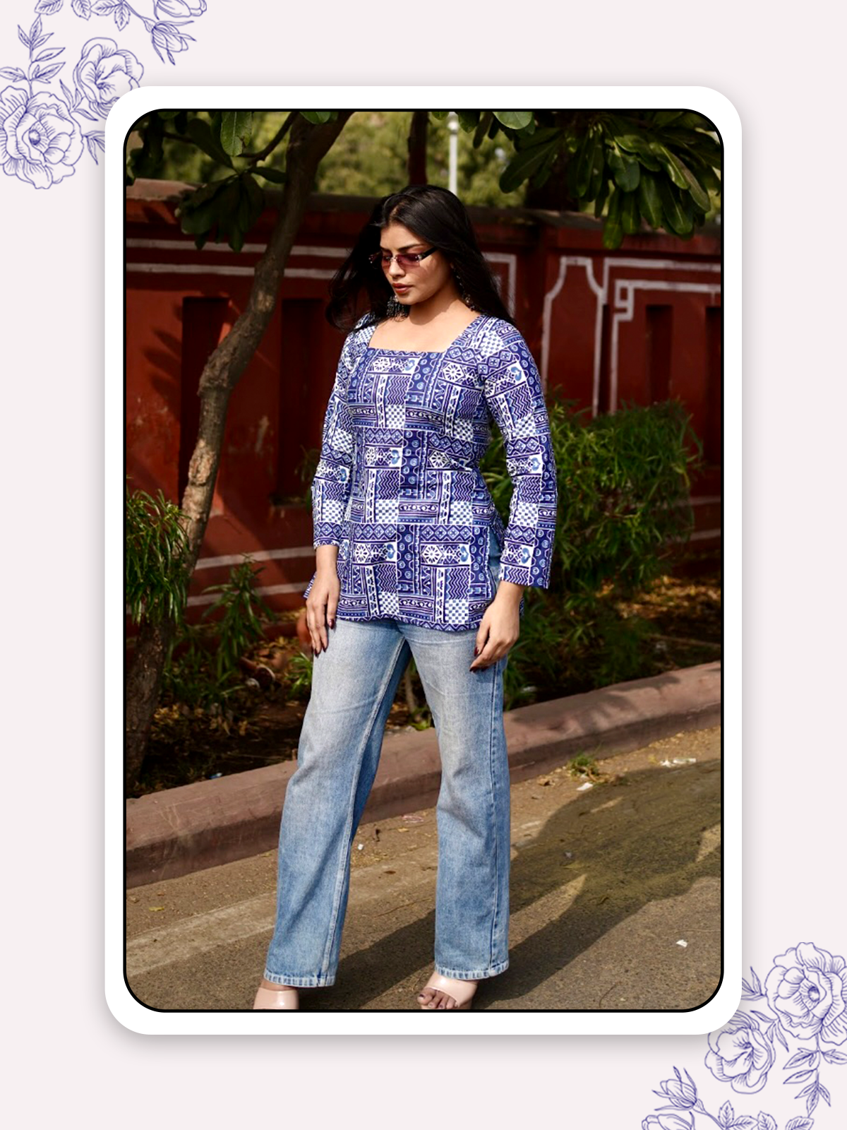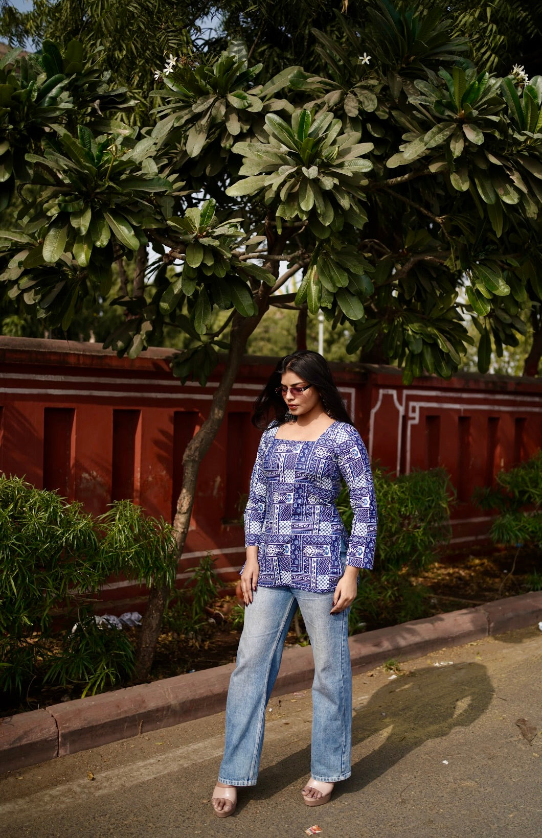 Blue indigo printed kurti with square neckline and corset back, structured yet feminine, blending tradition with modern fit.