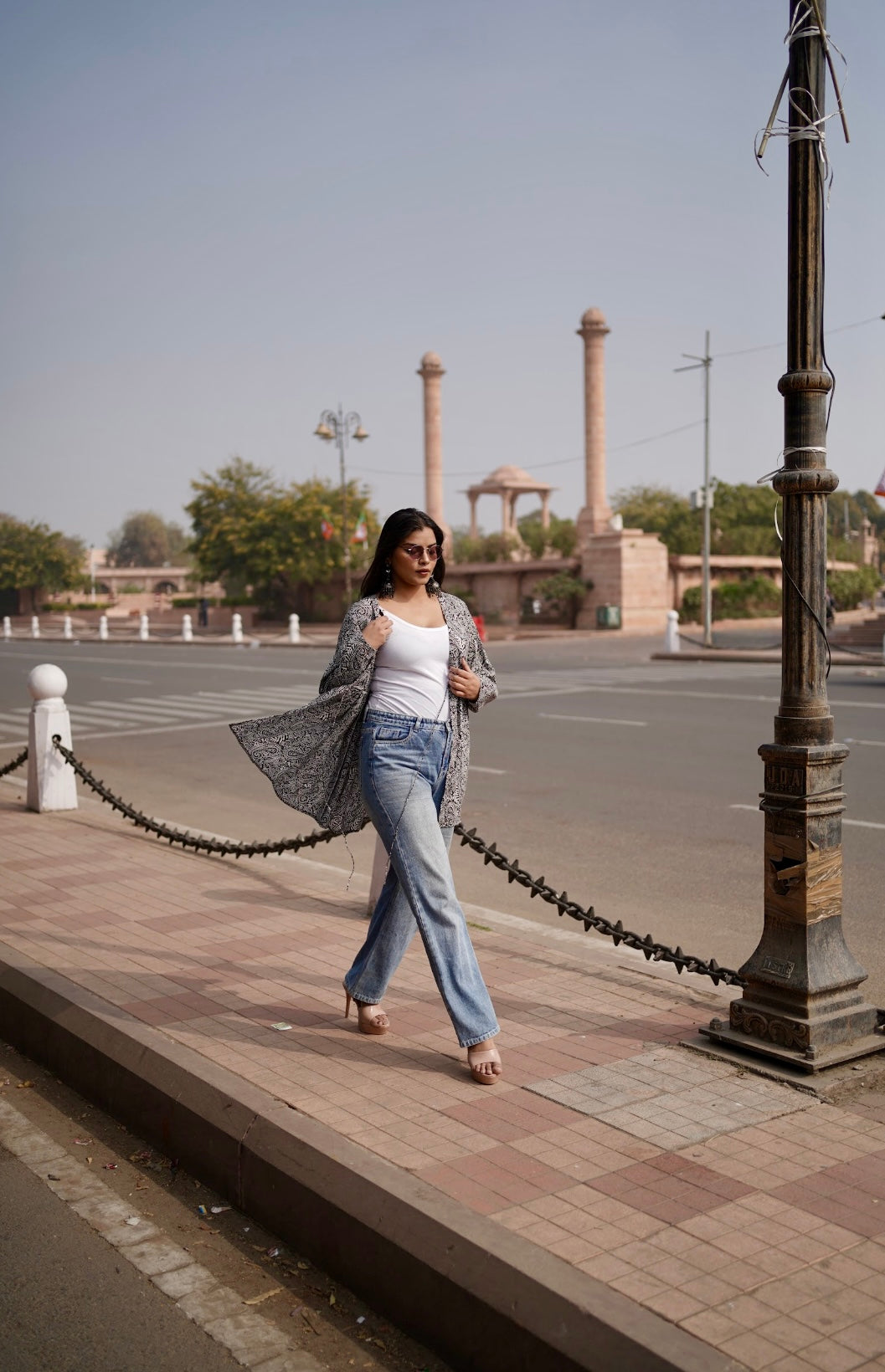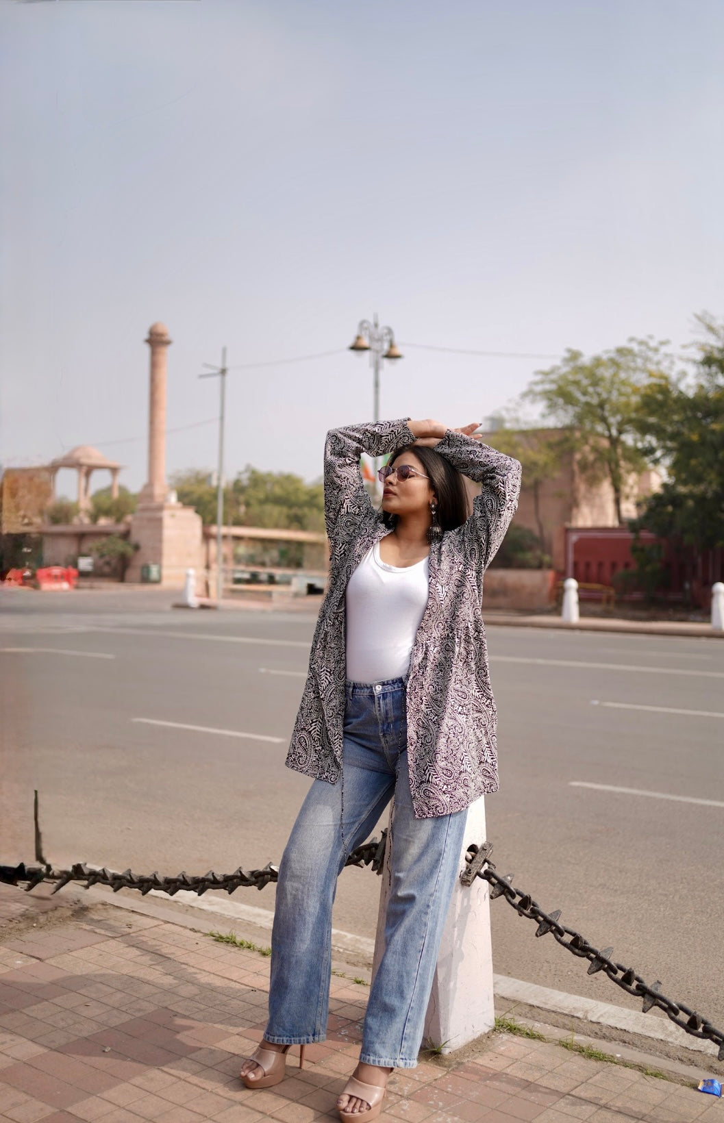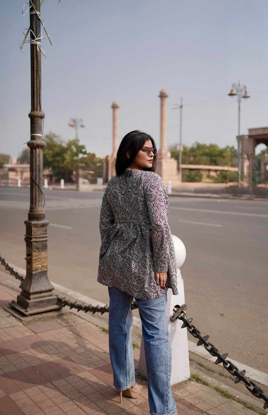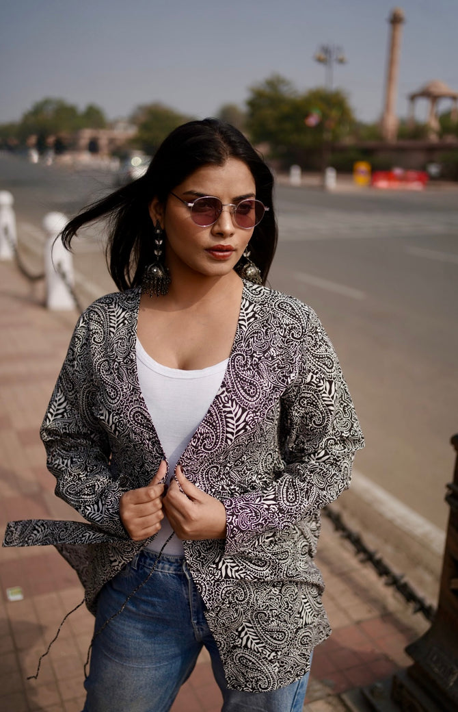 Black and white shrug kurti with Indian-style prints, chic and timeless, inspired by classic desi glamour.