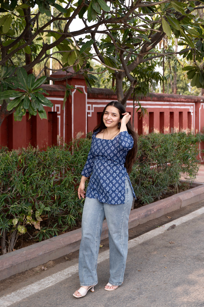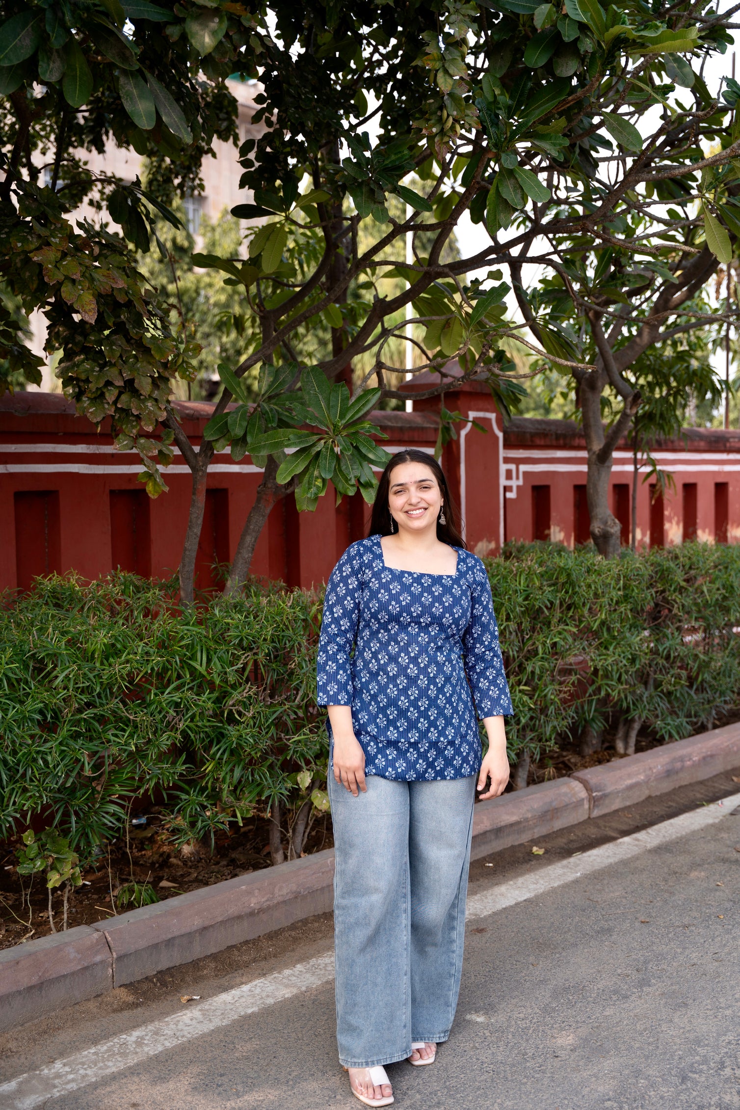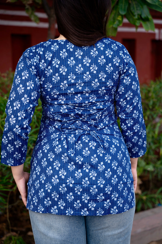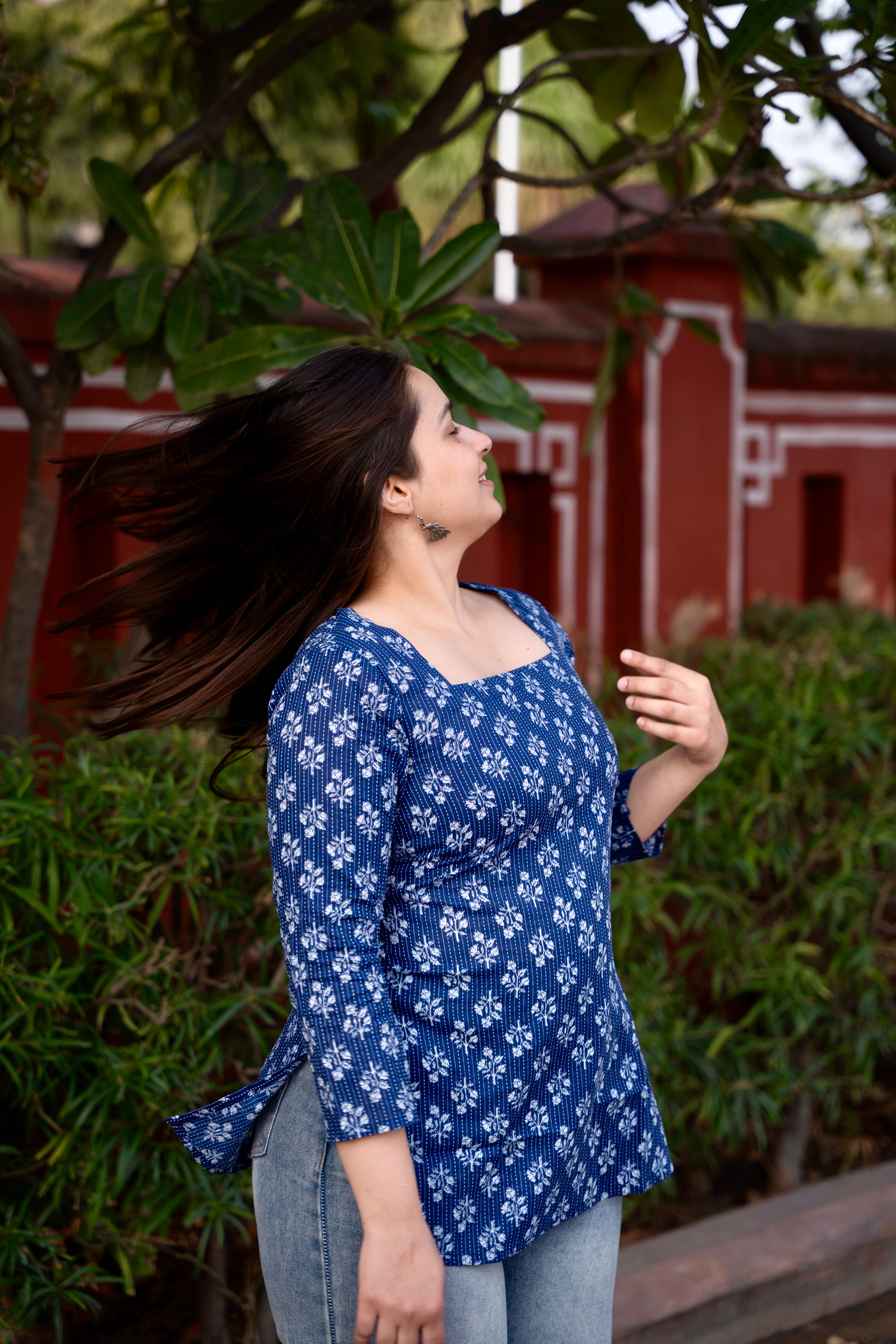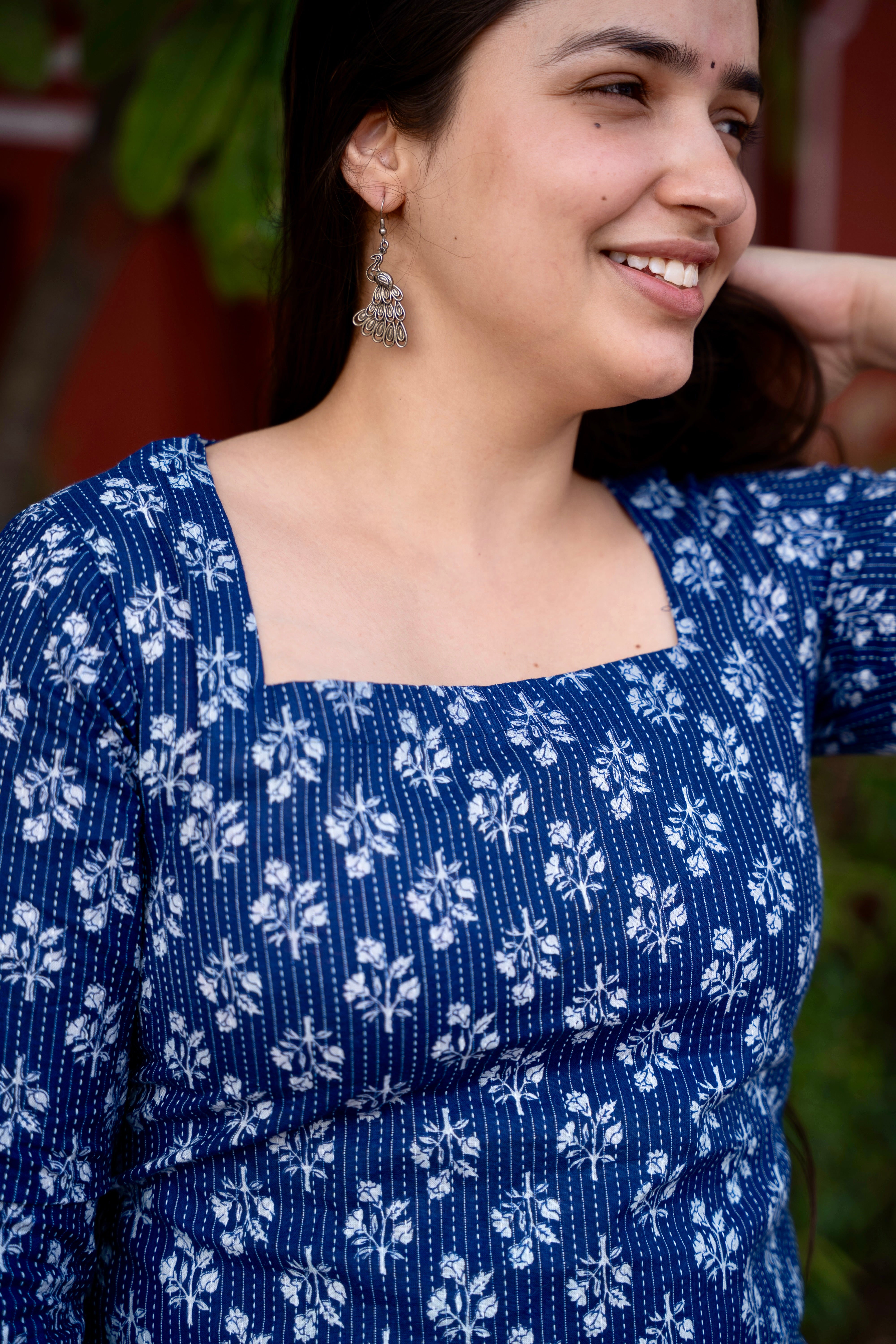 Blue Katha Exclusive Kurti is a perfect blend of everyday elegance and comfort. Crafted from soft, breathable fabric, this kurti features a rich blue base adorned with delicate white katha-inspired floral motifs, giving it a timeless handcrafted feel. Designed in a flattering hip-length straight silhouette with three-quarter sleeves, it offers effortless style and ease of movement. Ideal for casual outings, workwear, or relaxed day looks, this kurti pairs beautifully with jeans, palazzos, or straight pants