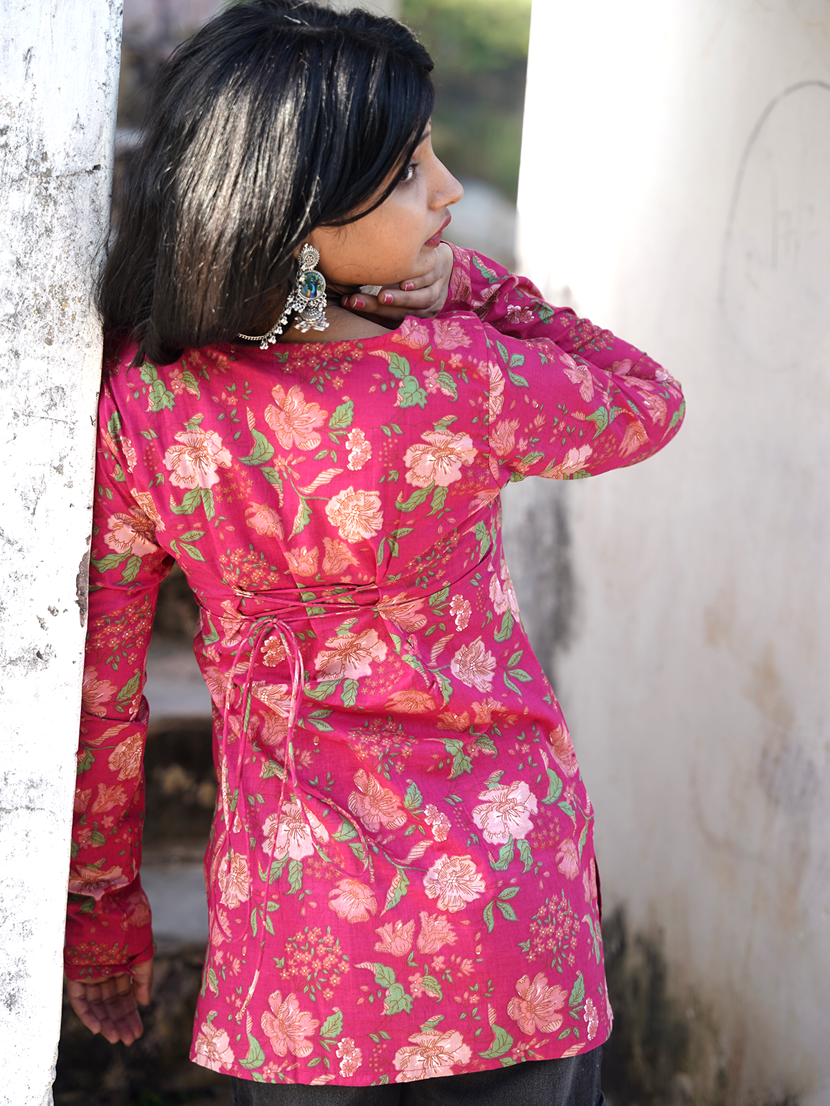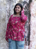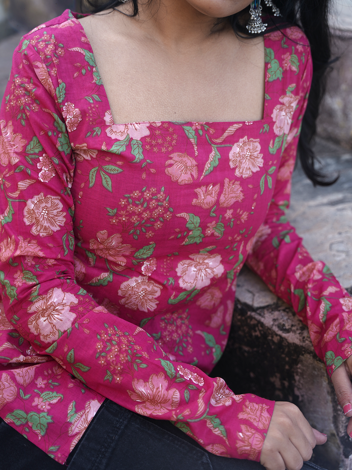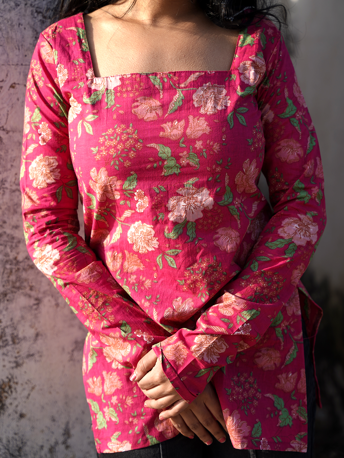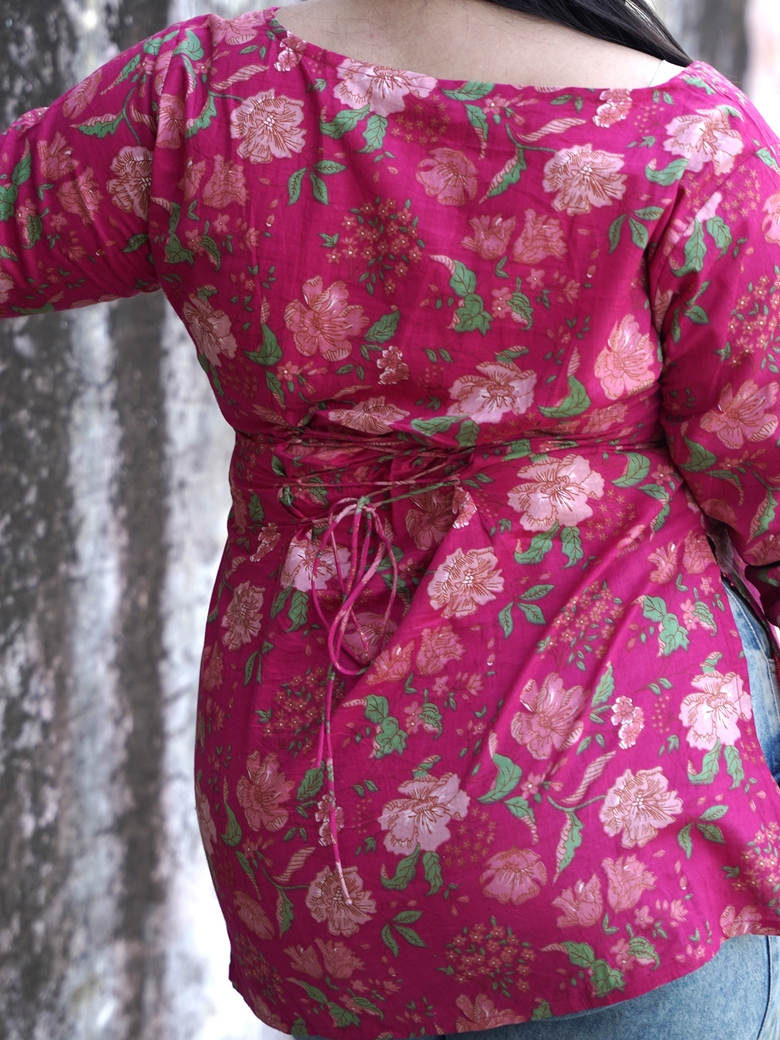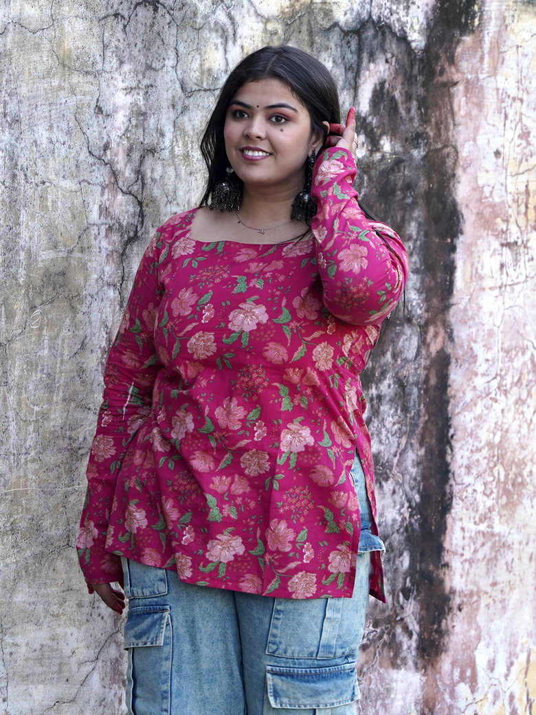 Gulabi Ankhen – Hot pink cotton short kurti with floral prints and square neck, playful and pretty, made to brighten every casual day.