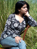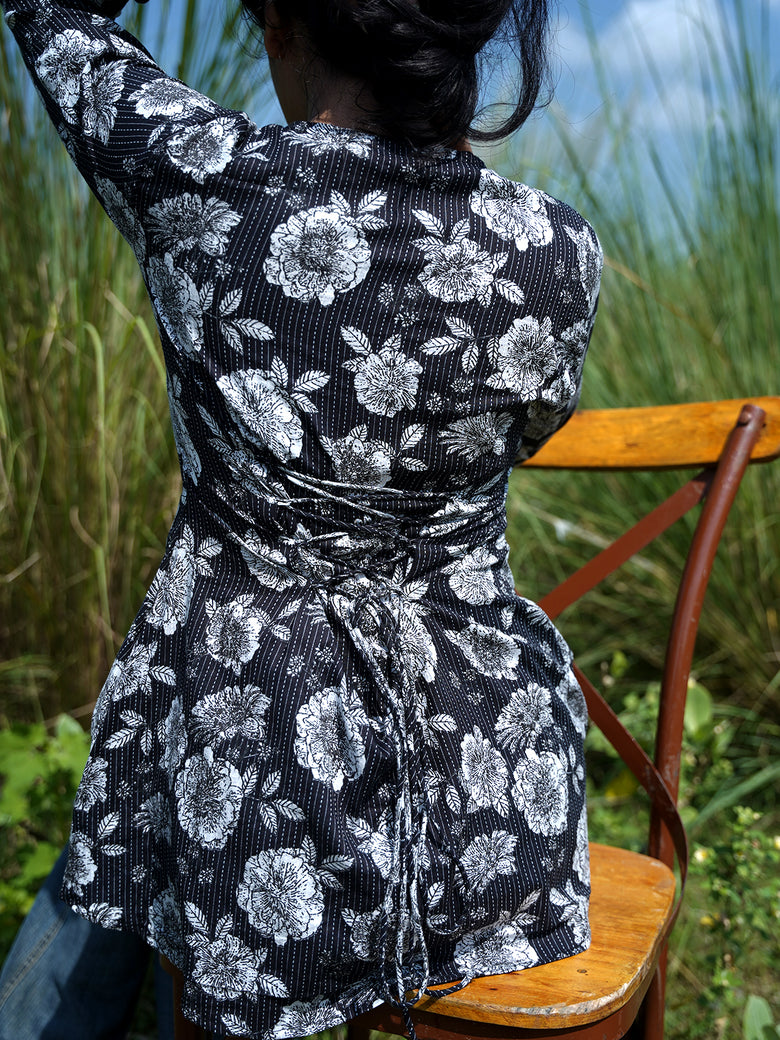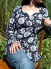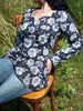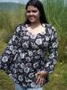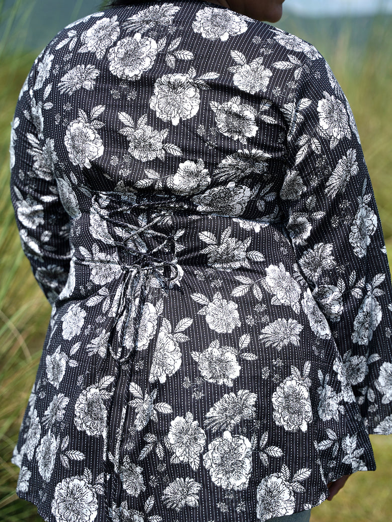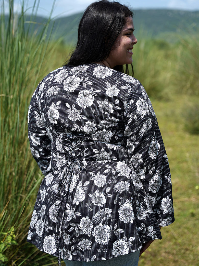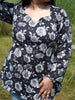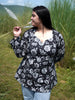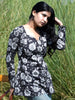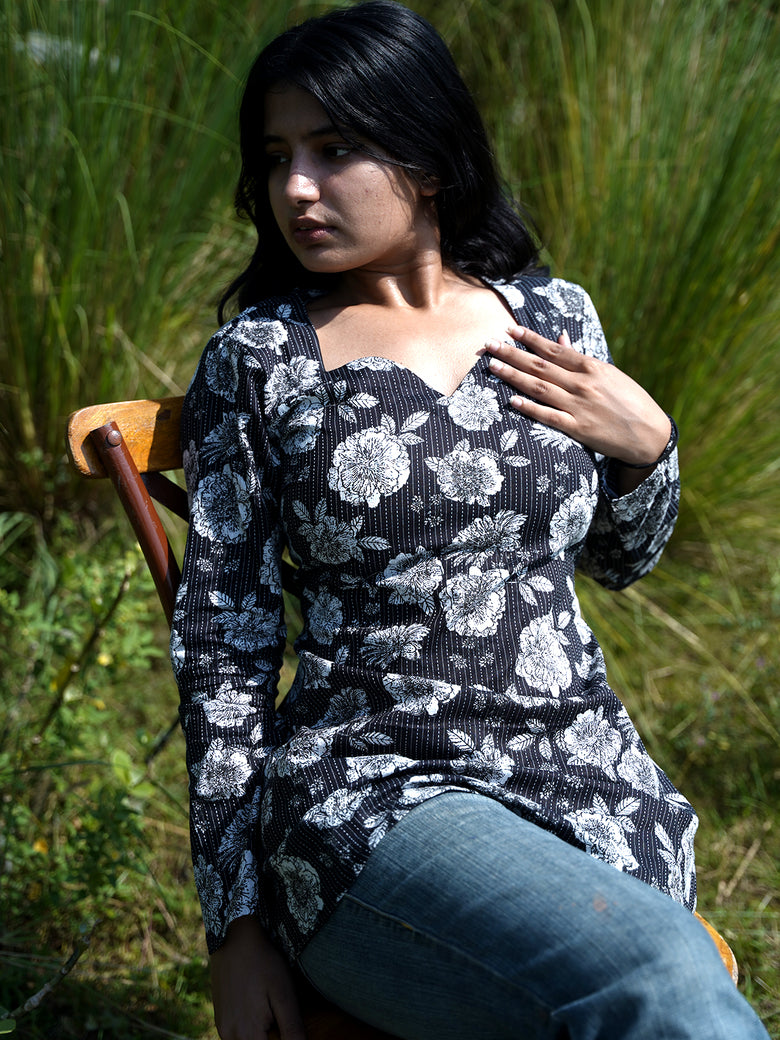 Black sweetheart-neck full sleeves kurti with big white floral prints, playful yet graceful, designed to make every day special.