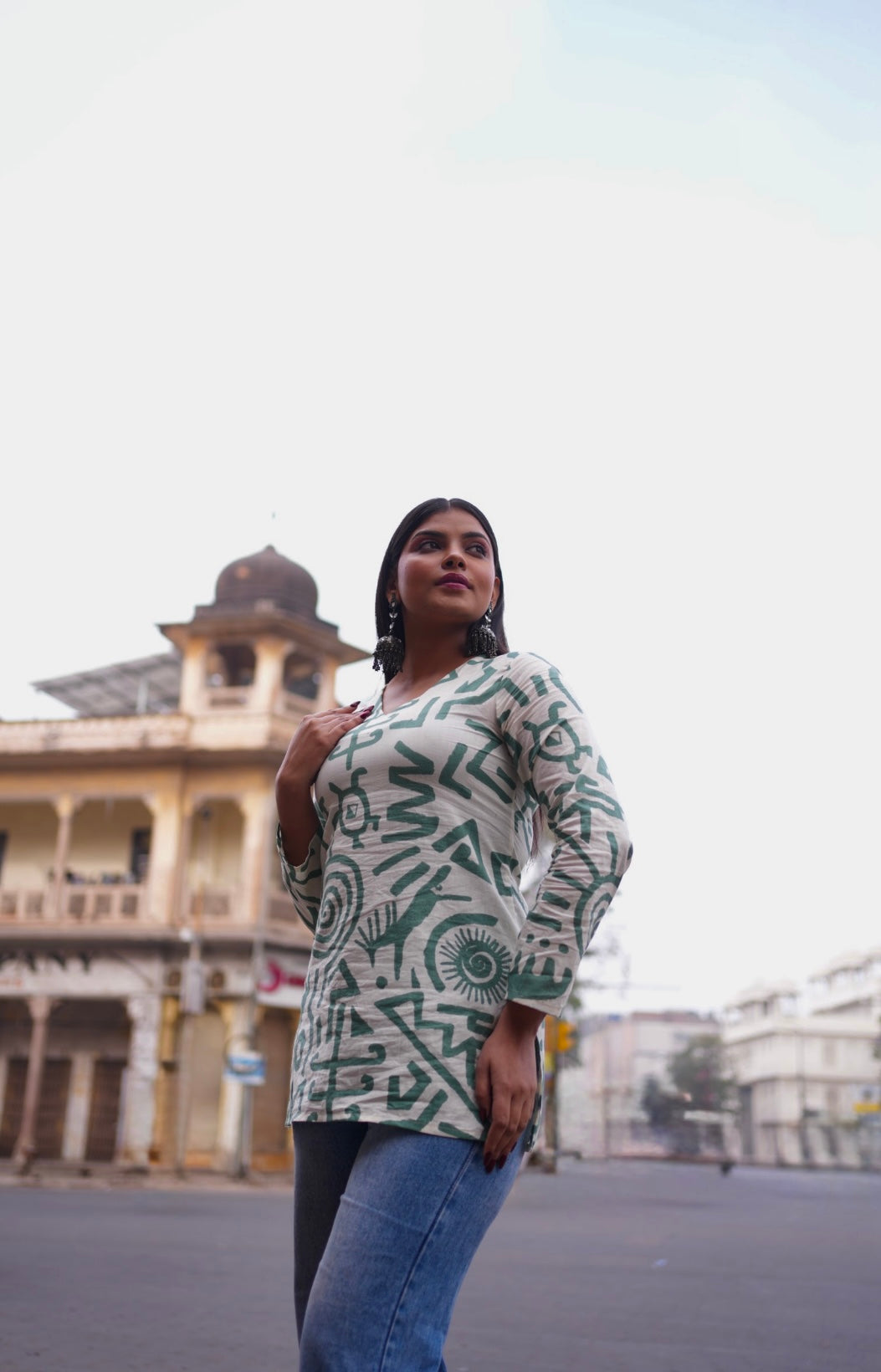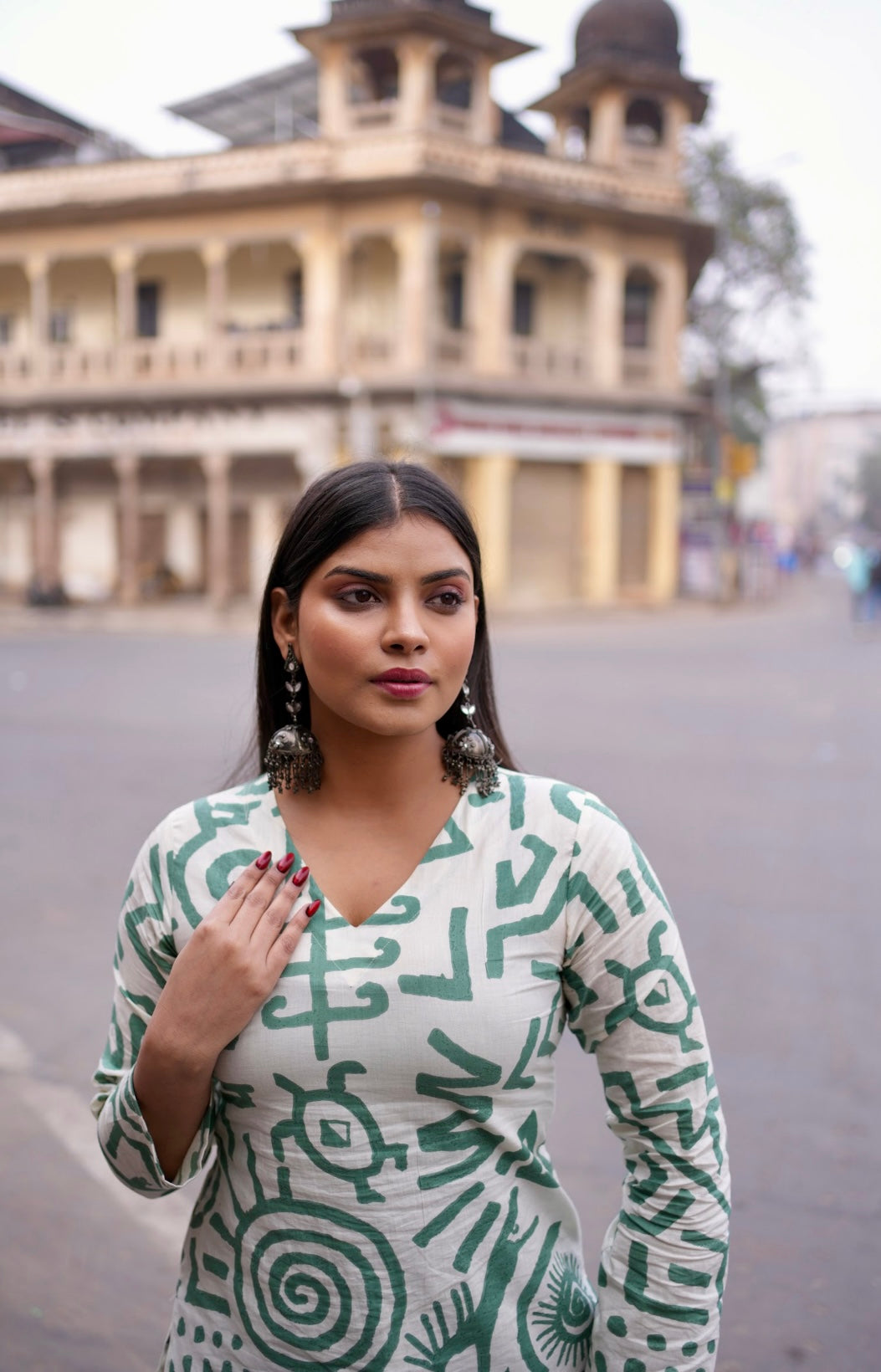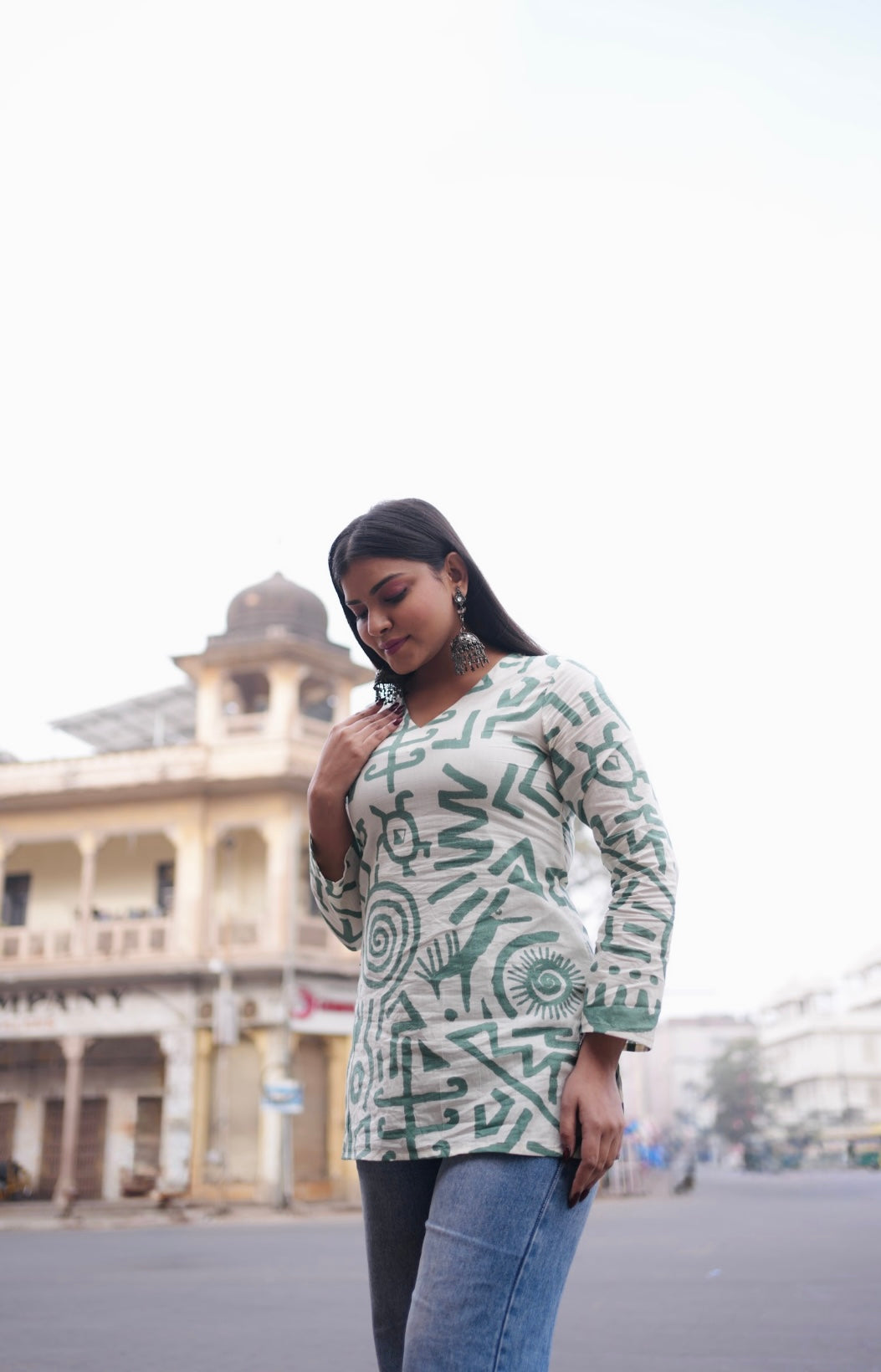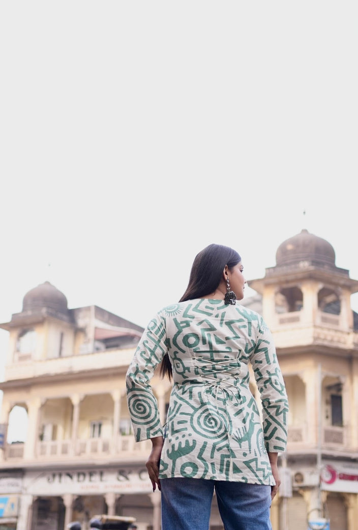 White V-neck short kurti with green abstract prints, minimal and soothing, made for effortless everyday wear.