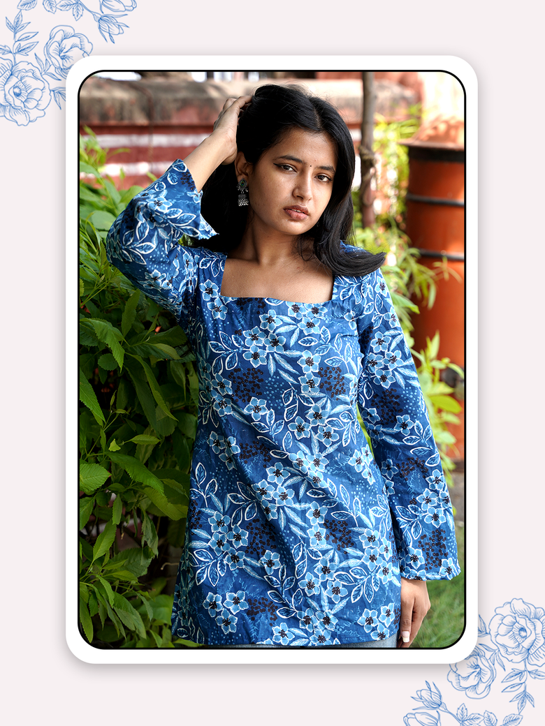 Blue bell-sleeved kurti with floral prints and square neck, pretty, poised, and designed to make heads turn safely.