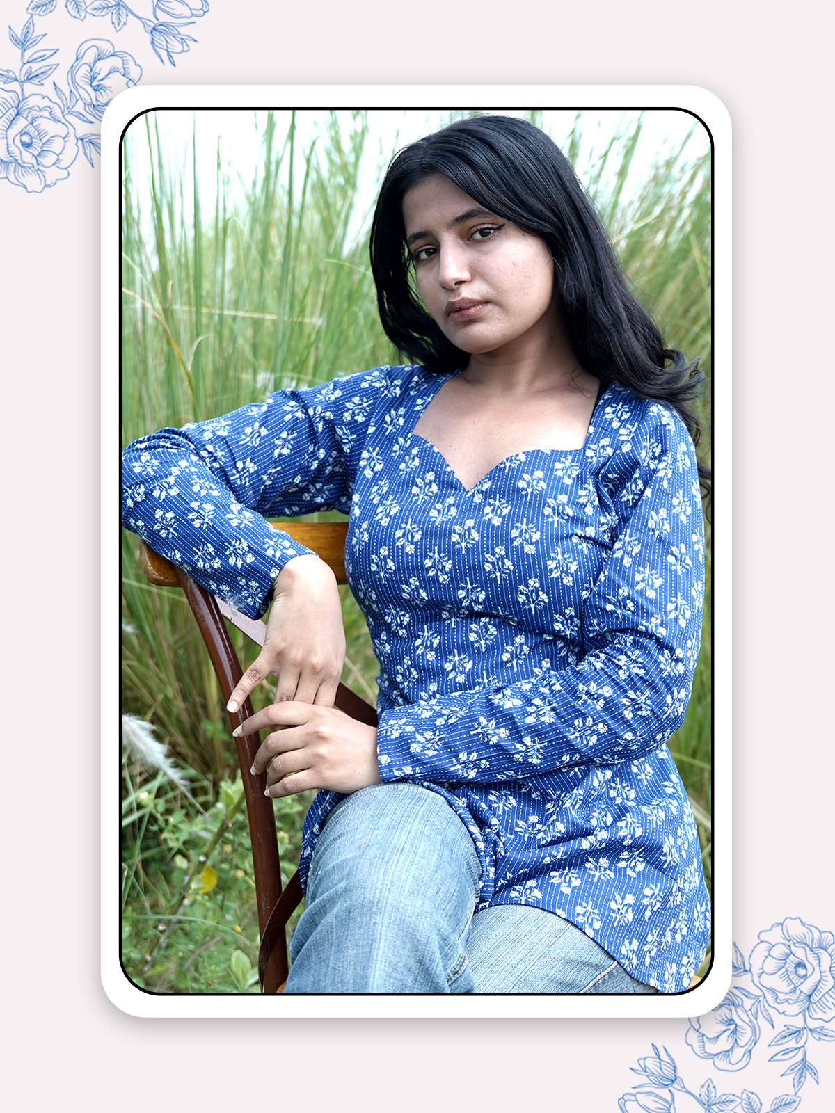 Blue sweetheart-neck full sleeves kurti with big white floral prints, dreamy and elegant, perfect for brunches, dates, and festivities.