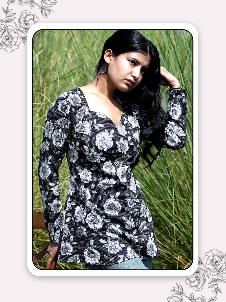 Black sweetheart-neck full sleeves kurti with big white floral prints, playful yet graceful, designed to make every day special.