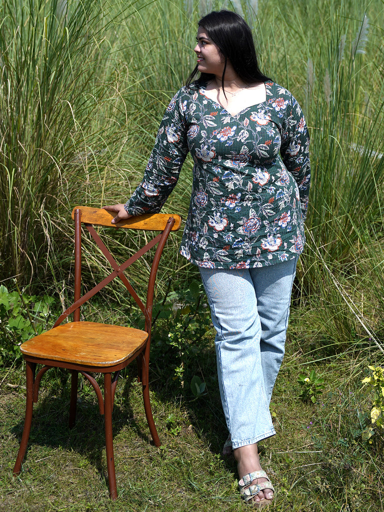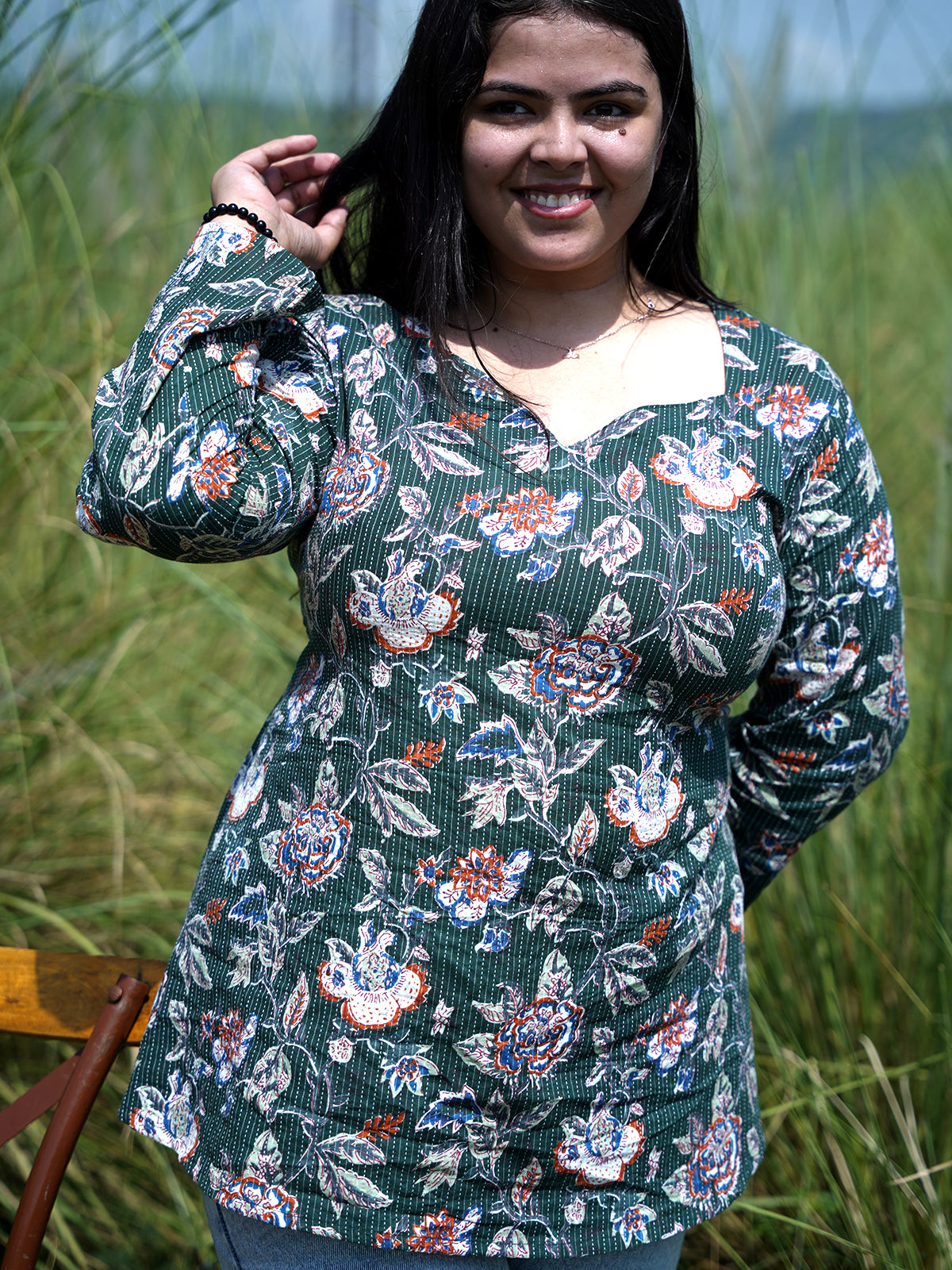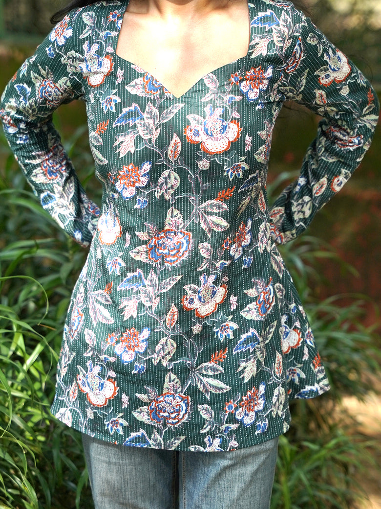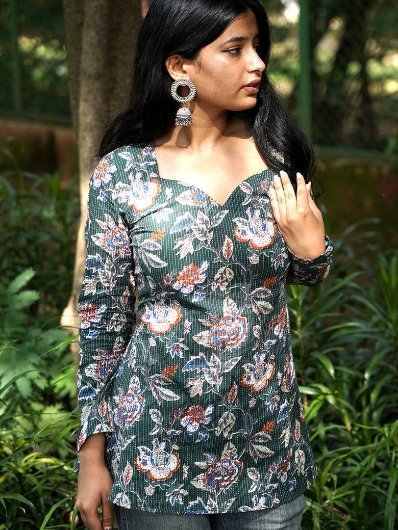 Green sweetheart-neck full sleeves kurti with big white floral prints, romantic and stylish, timeless beauty stitched in comfort.