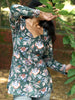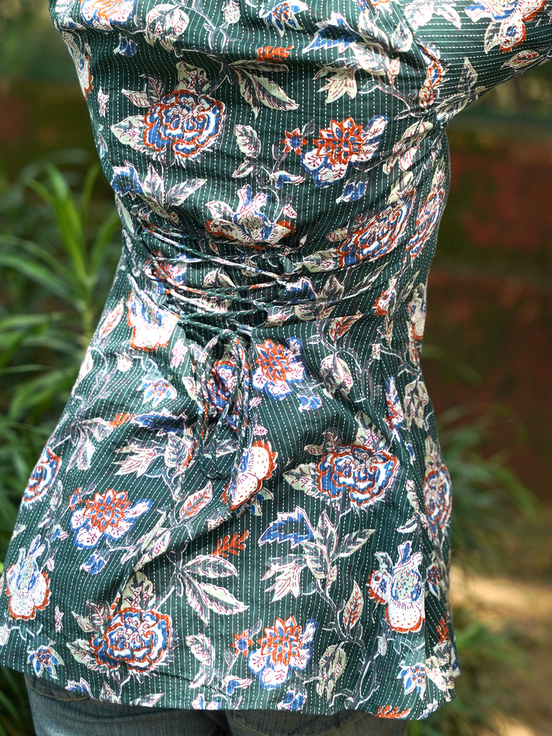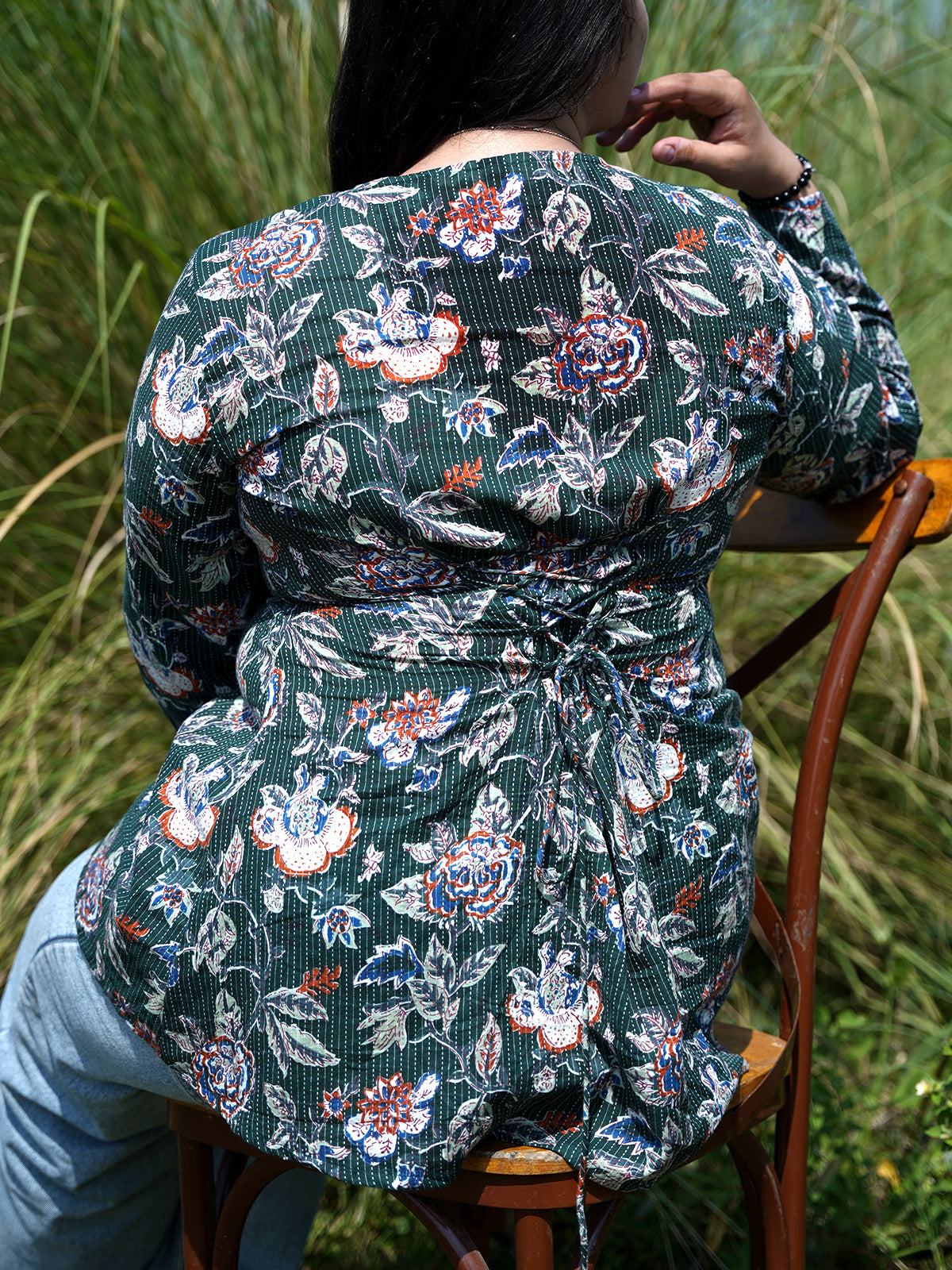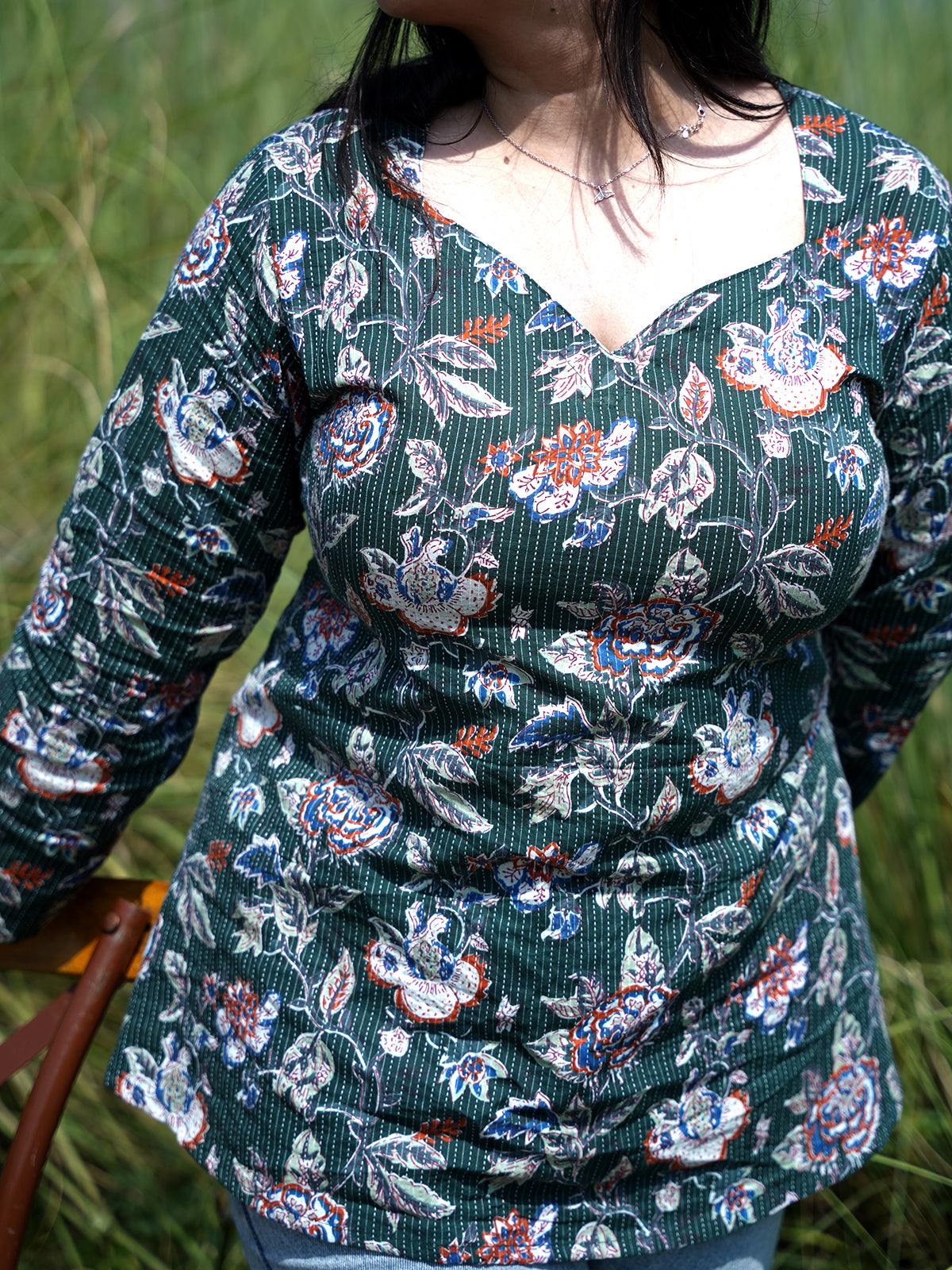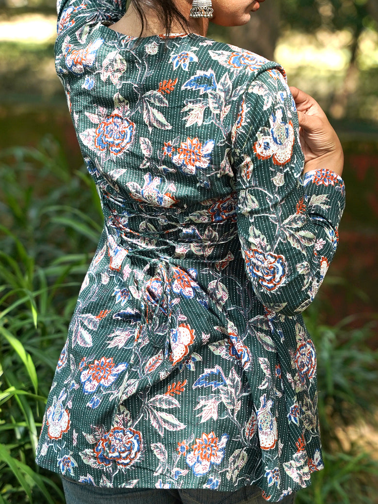Green sweetheart-neck full sleeves kurti with big white floral prints, romantic and stylish, timeless beauty stitched in comfort.
