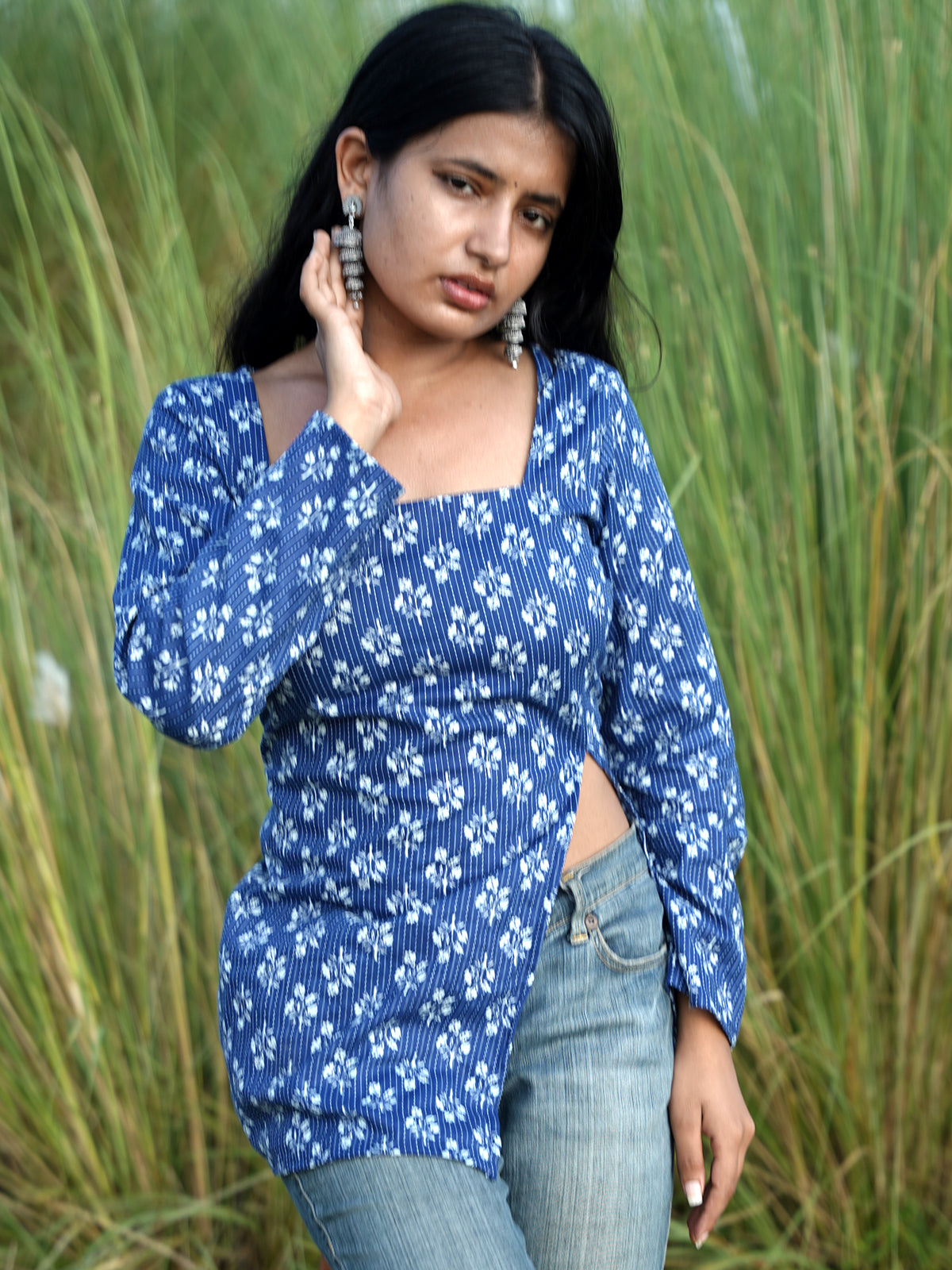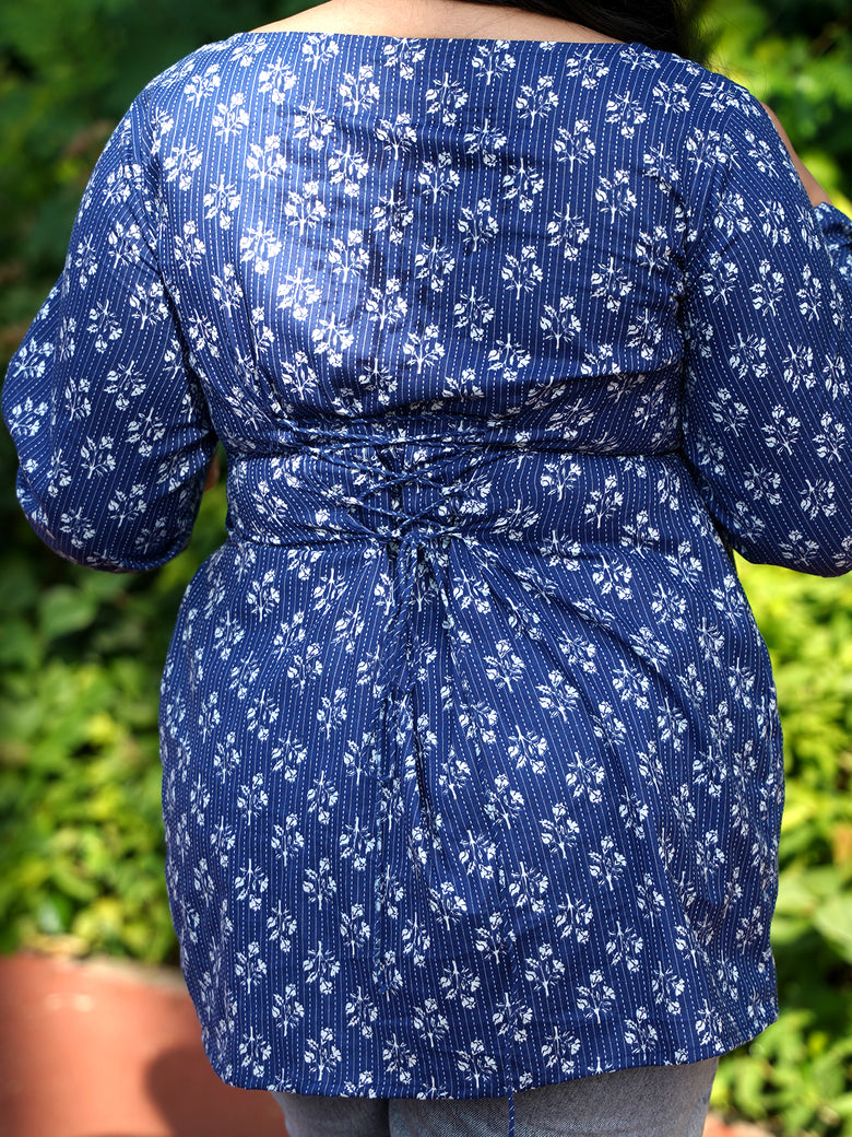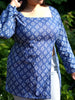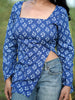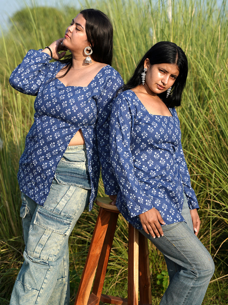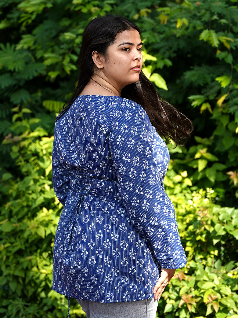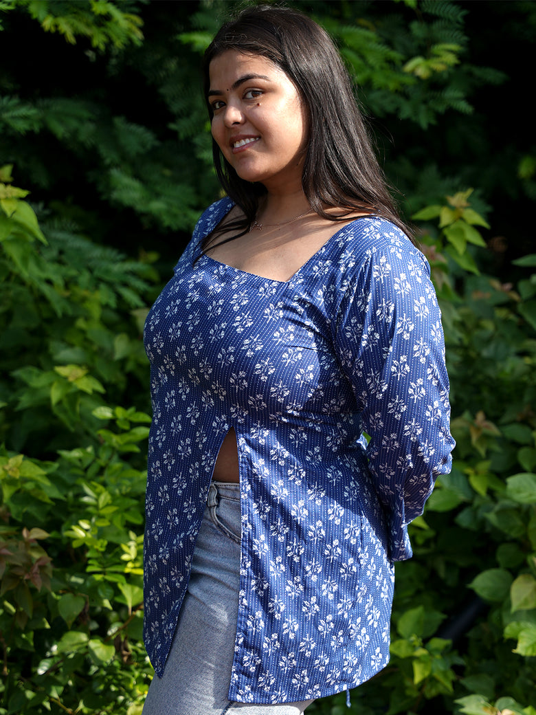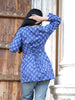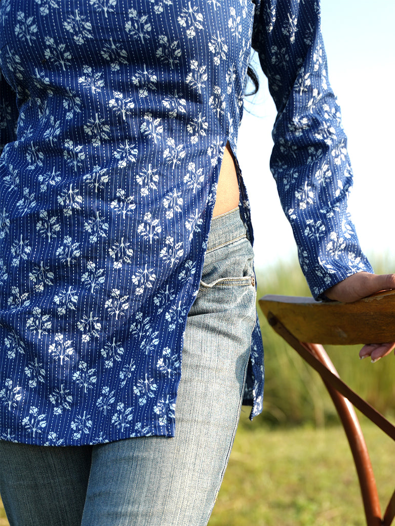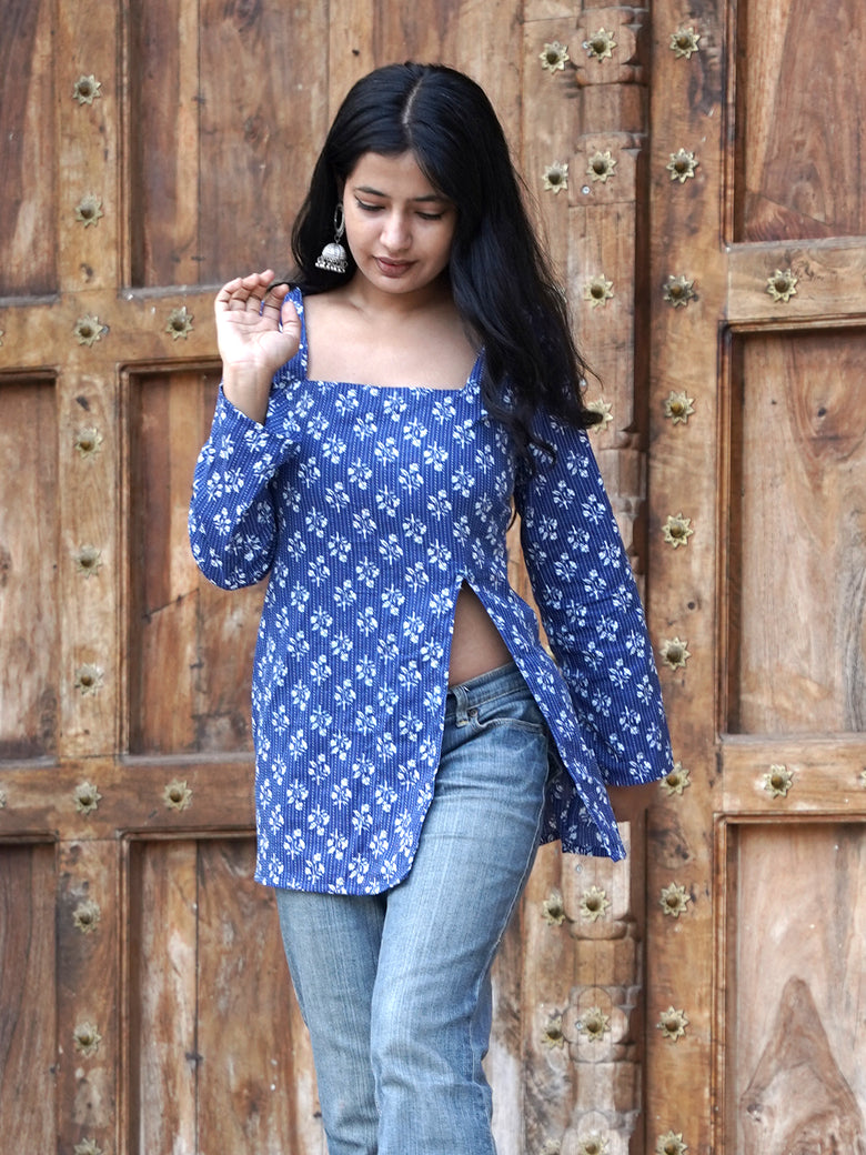 Blue full sleeves kurti with front slit and tiny white prints, elegant, flowy, and made to keep you graceful yet comfy.
