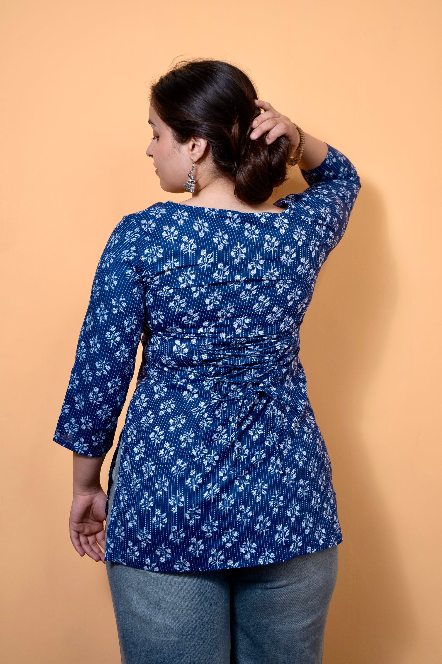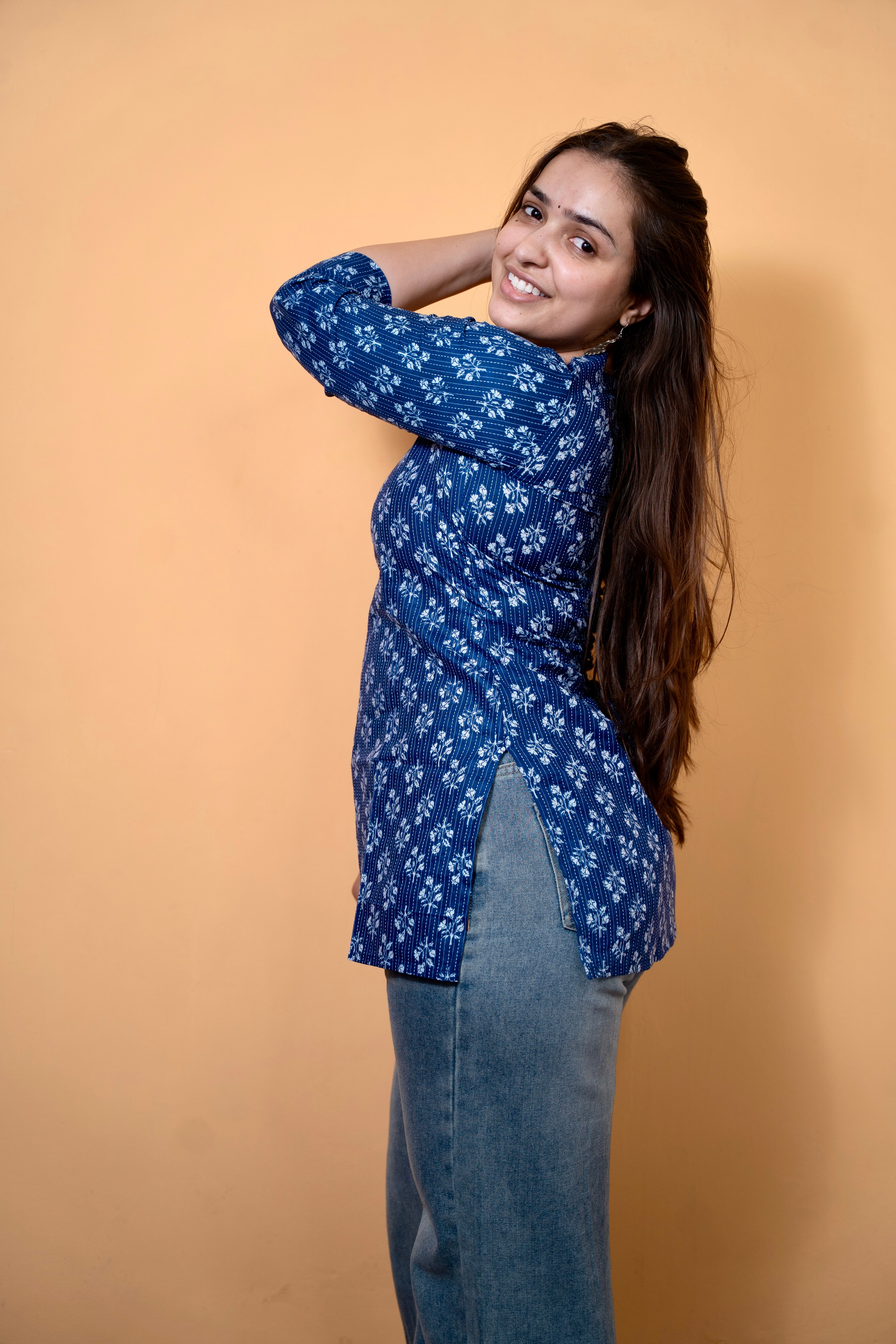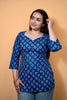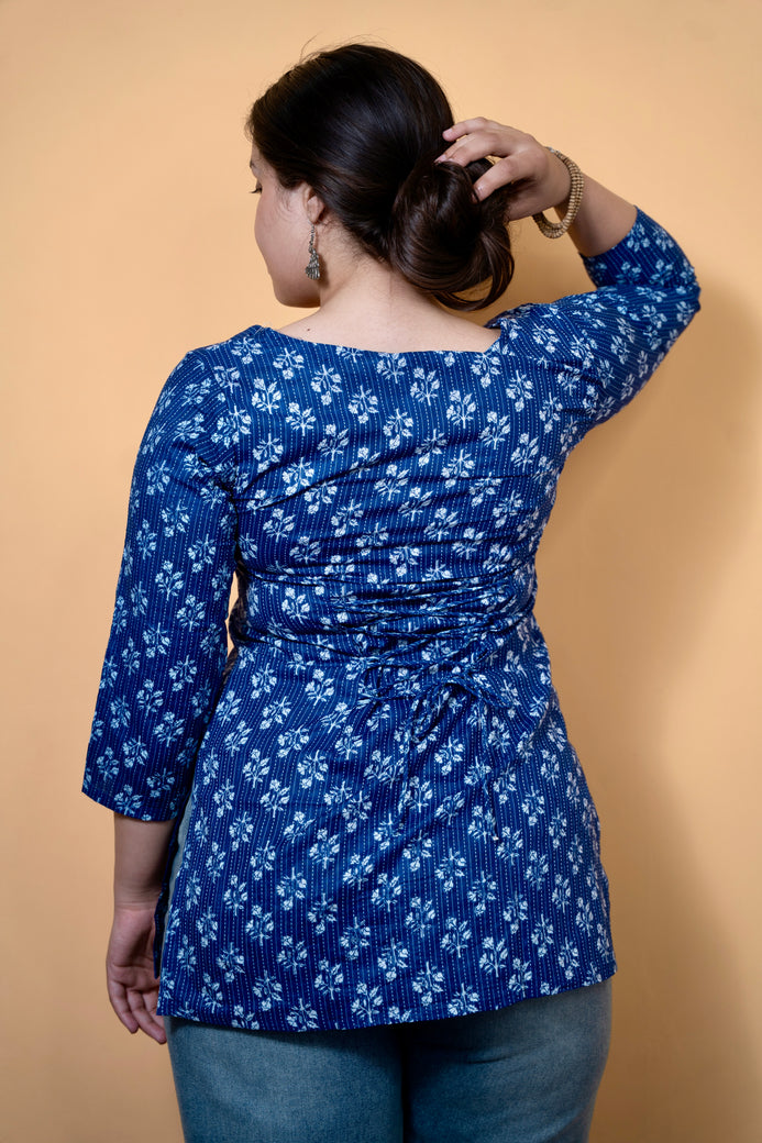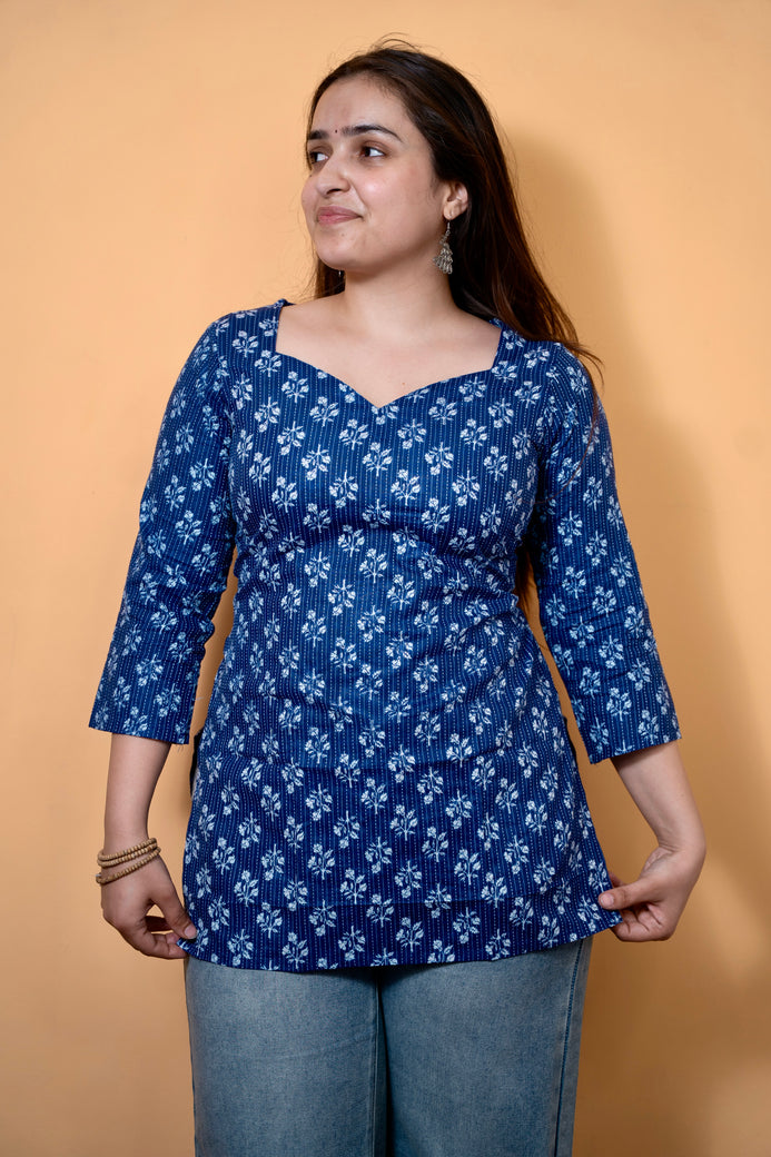 Blue Sweetheart Neck Katha Kurti is a graceful blend of handcrafted charm and modern comfort. Made from soft, breathable fabric, this kurti features a rich indigo blue base highlighted with delicate white katha-inspired floral motifs. Designed in a flattering hip-length straight silhouette, it comes with an elegant sweetheart neckline and three-quarter sleeves, adding a feminine touch to the overall look. Perfect for casual outings, workwear, or everyday ethnic styling, it pairs effortlessly with jeans, palazzos, or straight pants