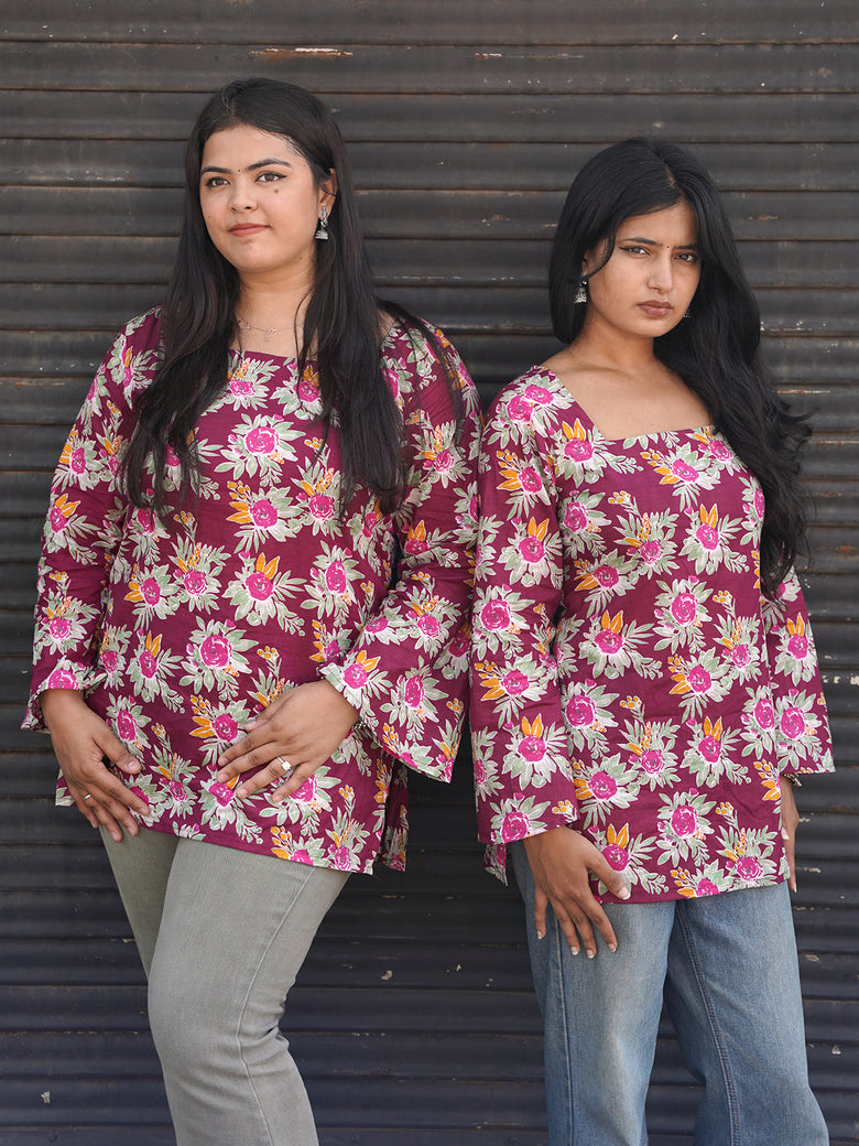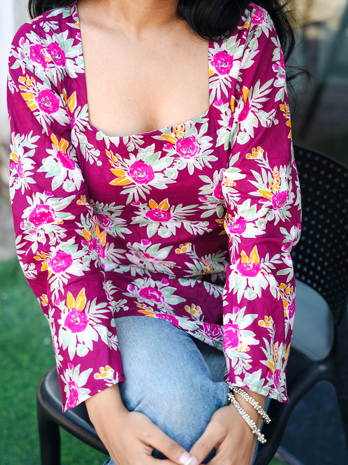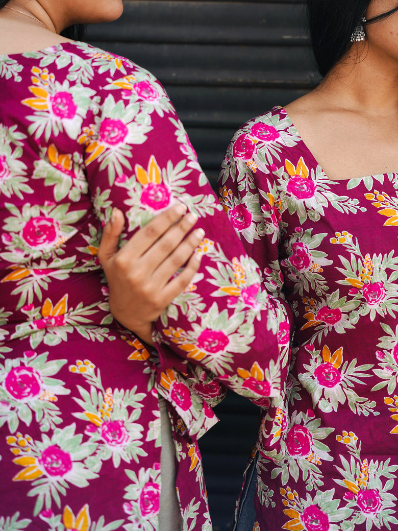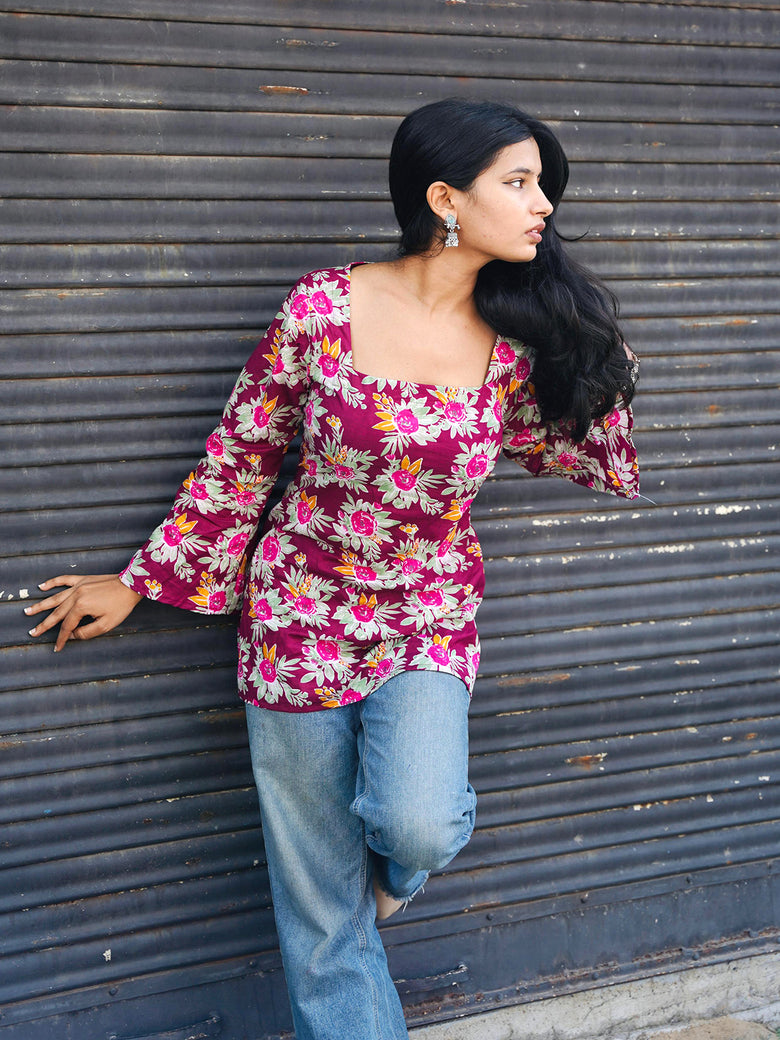 Purple bell-sleeved kurti with floral prints and square neck, unapologetically glam with a flair for drama.