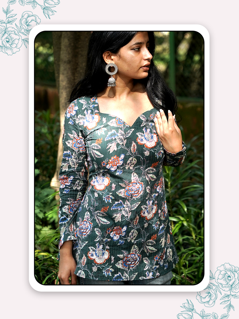 Green sweetheart-neck full sleeves kurti with big white floral prints, romantic and stylish, timeless beauty stitched in comfort.