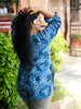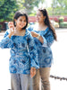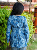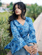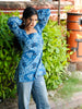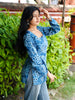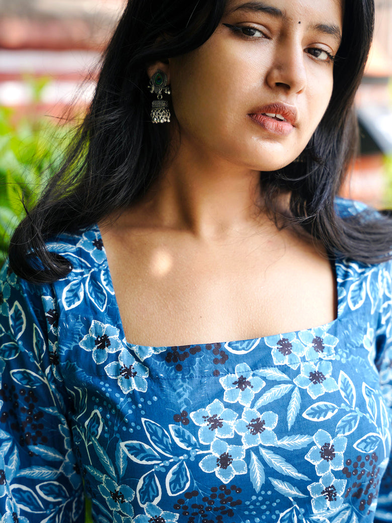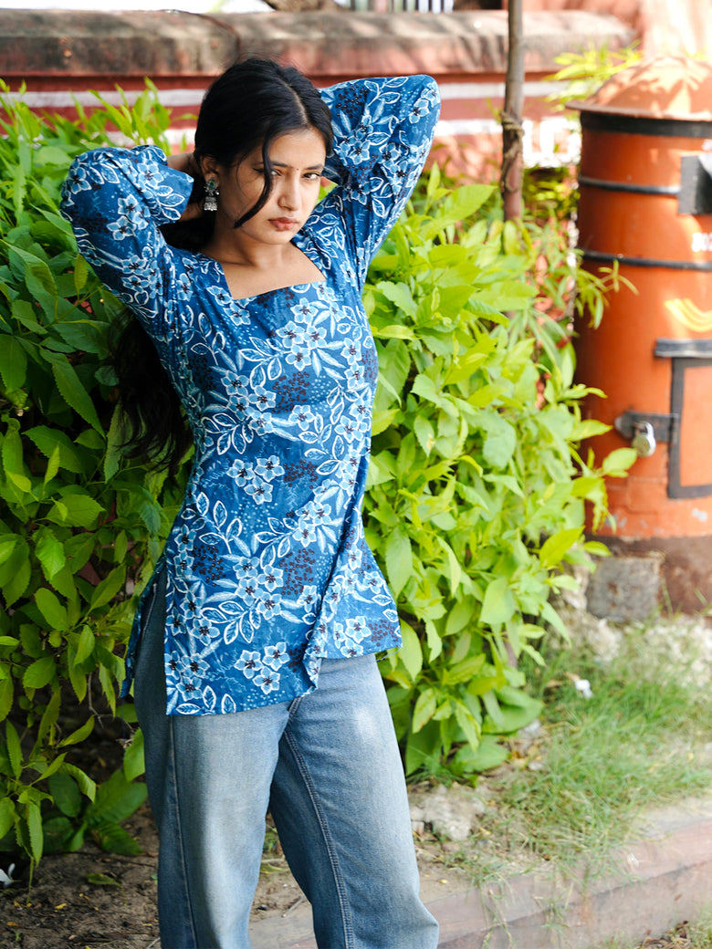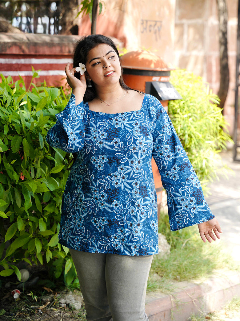 Blue bell-sleeved kurti with floral prints and square neck, pretty, poised, and designed to make heads turn safely.