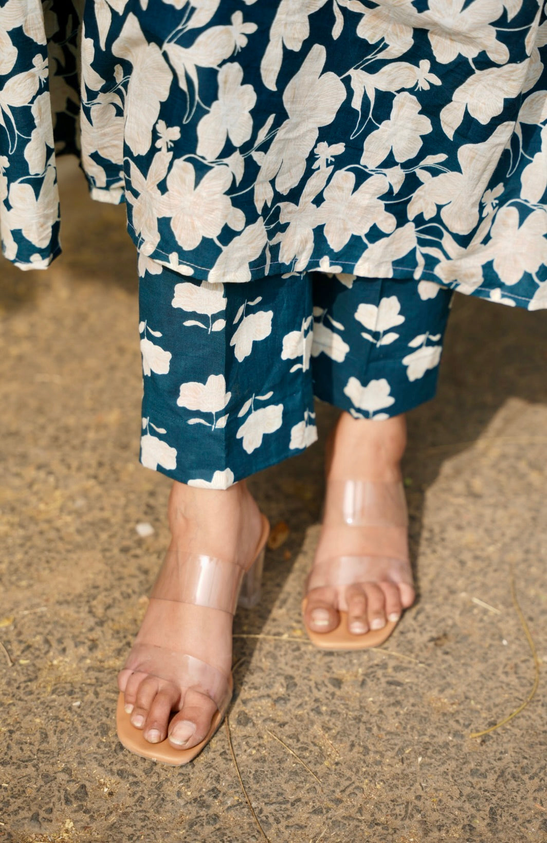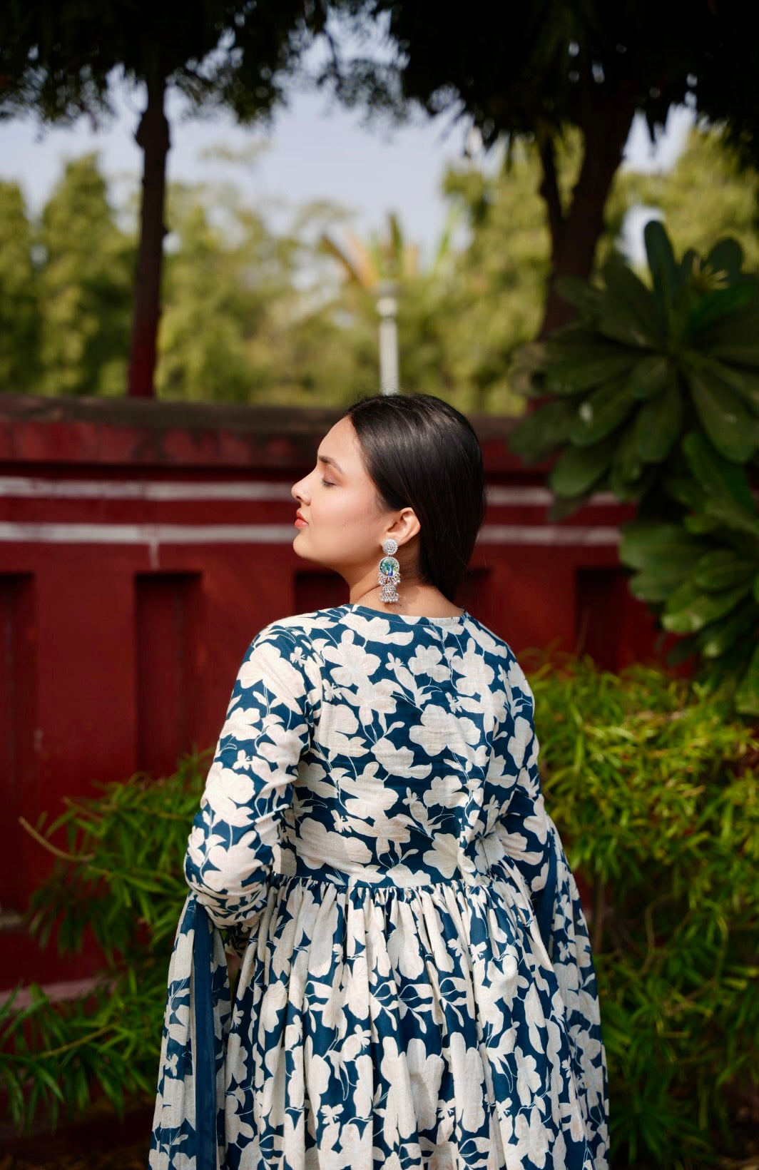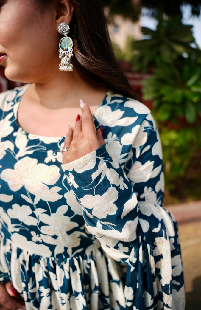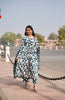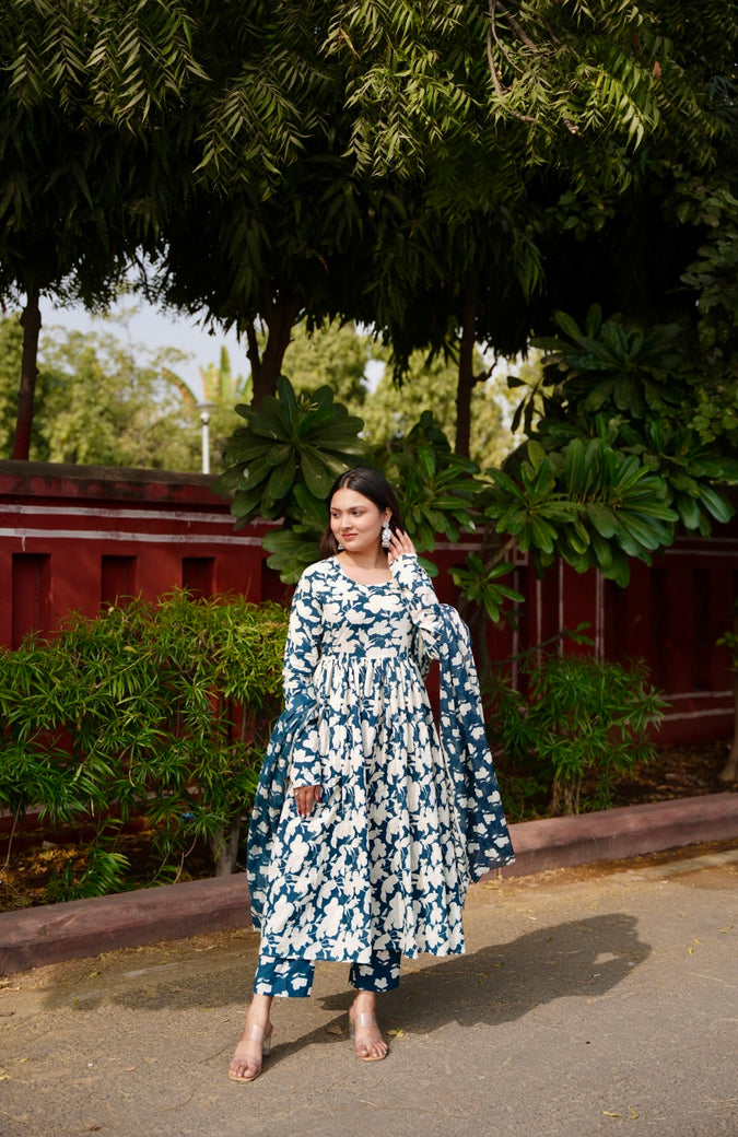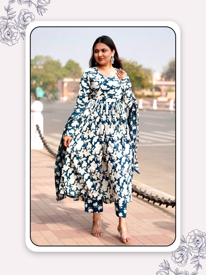 Saanjh – Blue anarkali adorned with white floral prints, paired with pants and dupatta, capturing the calm beauty of dusk.